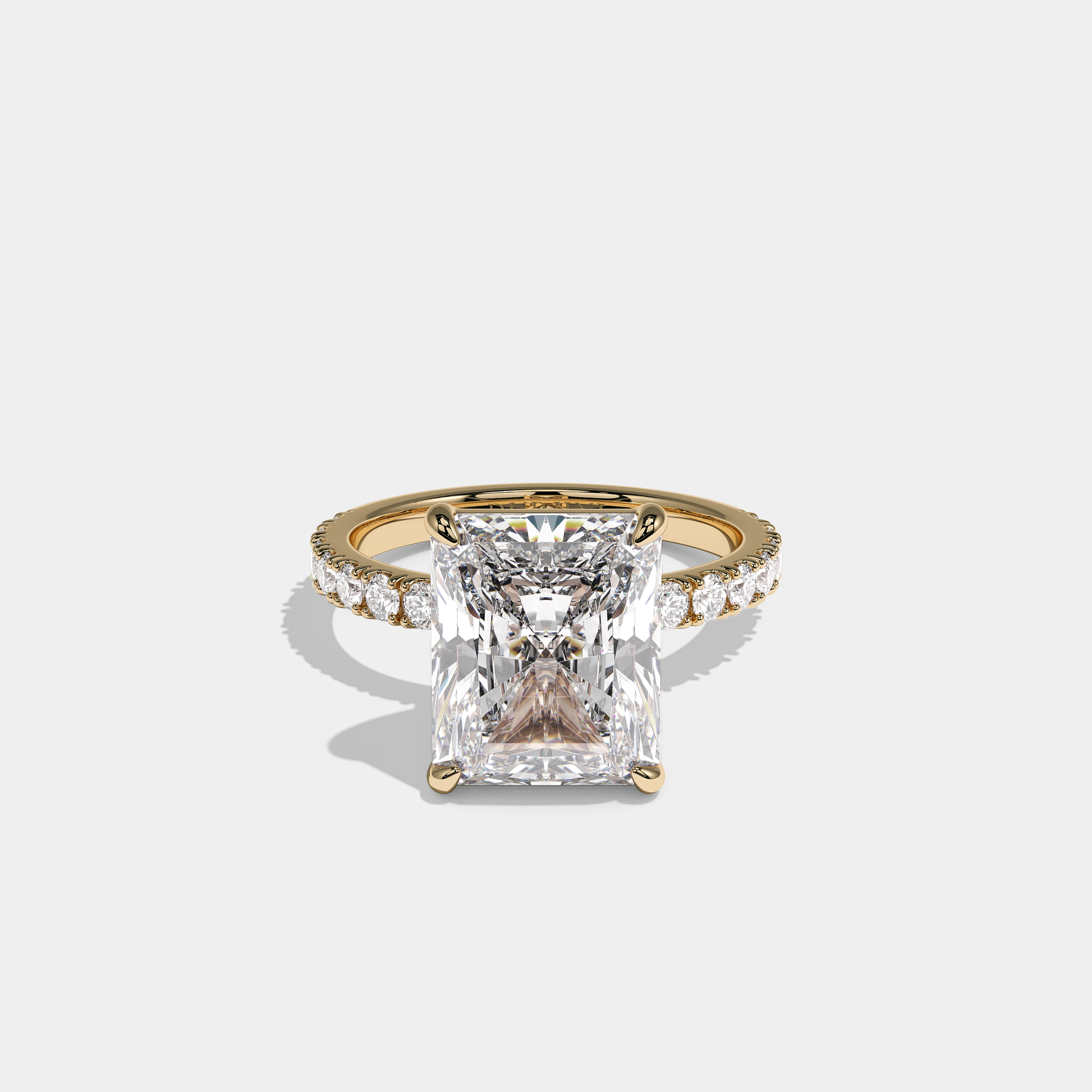 The radiant-cut centre stone’s crisp geometry and brilliant facets are intensified by the halo, which magnifies its sparkle and accentuates its rectangular silhouette. The saturated tone of yellow gold adds depth, contrast, and an unmistakable heirloom character, infusing the ring with aristocratic glamour. Ideal for those who dream of a golden engagement ring with commanding presence and contemporary refinement, Aerion Royale offers a timeless blend of radiance, structure, and distinguished elegance.