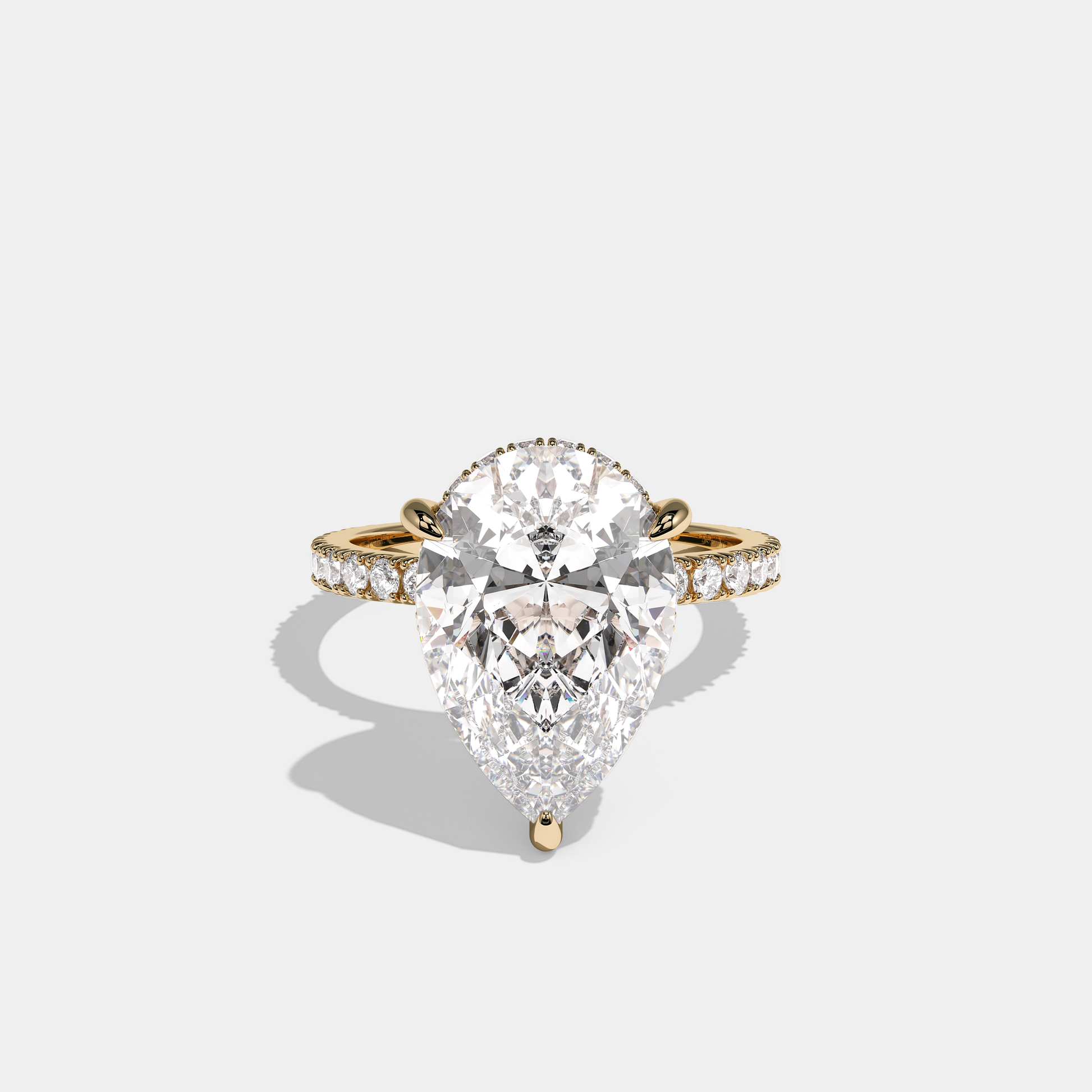 Aurisse Duchess, the exquisitely composed 8.00 carat total weight Diamond Pear Halo Engagement Ring in 18K yellow gold, marries teardrop romance with noble golden warmth. A pear-cut centre diamond, traced by a halo of round brilliant diamonds, is set in the rich glow of yellow gold to create a ring that feels both opulent and gently regal. Worn alone or with a curved gold or diamond band, Aurisse Duchess evokes the poise and grace of a modern-day duchess.