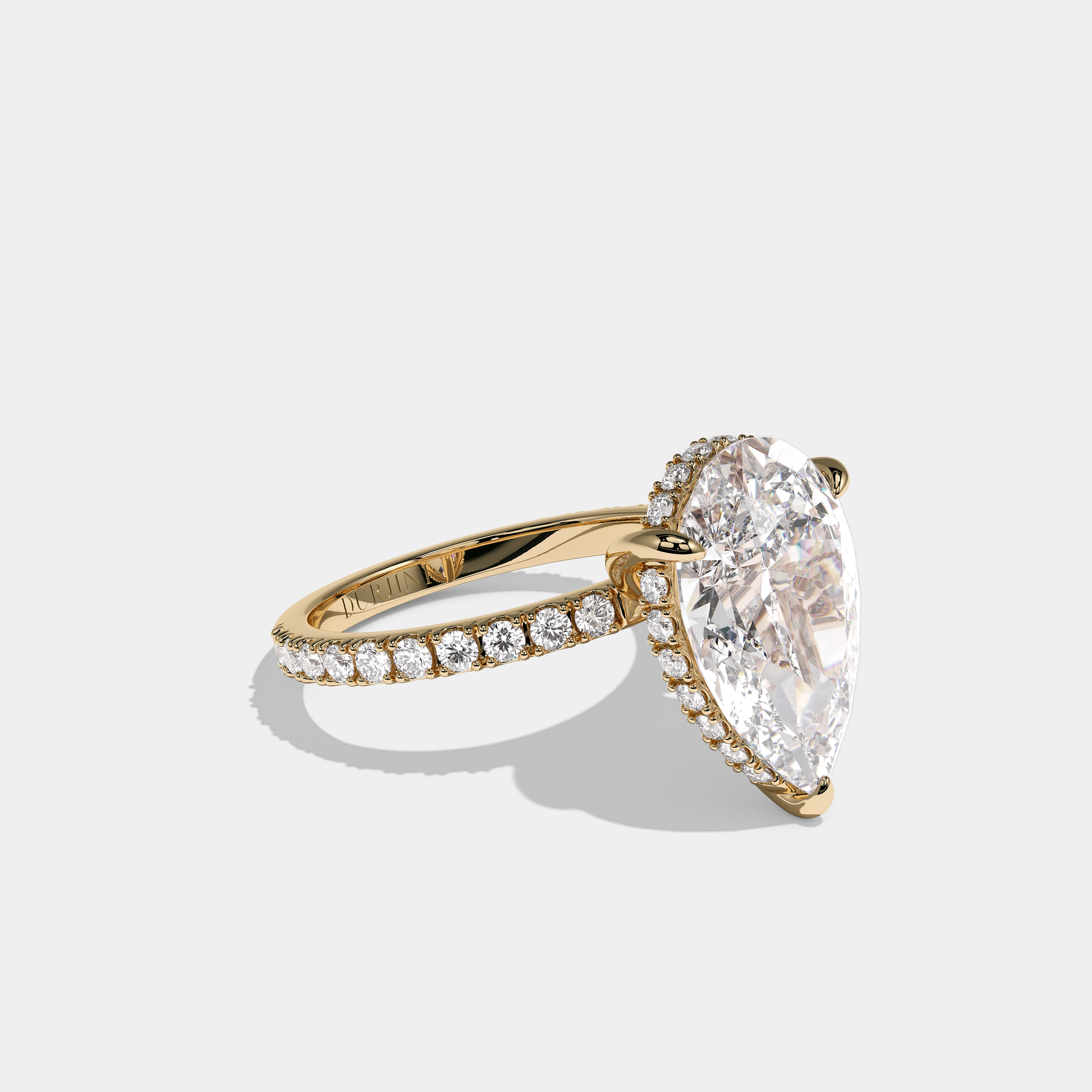 The pear-cut centre stone’s distinctive shape—softly rounded at one end and elegantly tapered at the other—offers a flattering, lengthening effect on the hand while delivering a fluid, cascading sparkle. The halo enhances its outline, intensifying light return and giving the diamond an even more defined, romantic silhouette. The saturated tone of 18K yellow gold introduces warmth, contrast, and an heirloom character that deepens the overall richness of the design. Ideal for those who dream of a golden engagement ring with storybook charm and refined presence, Aurisse Duchess is a timeless blend of radiance, elegance, and quiet nobility.