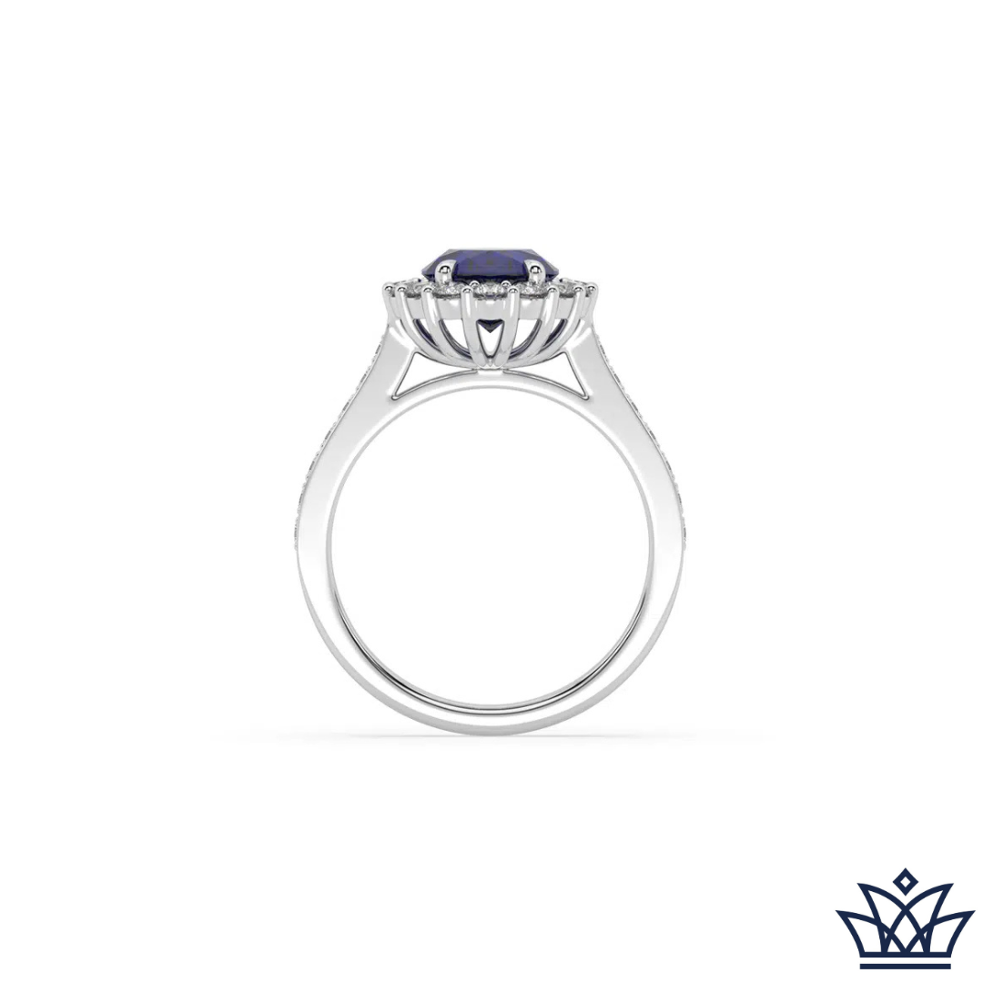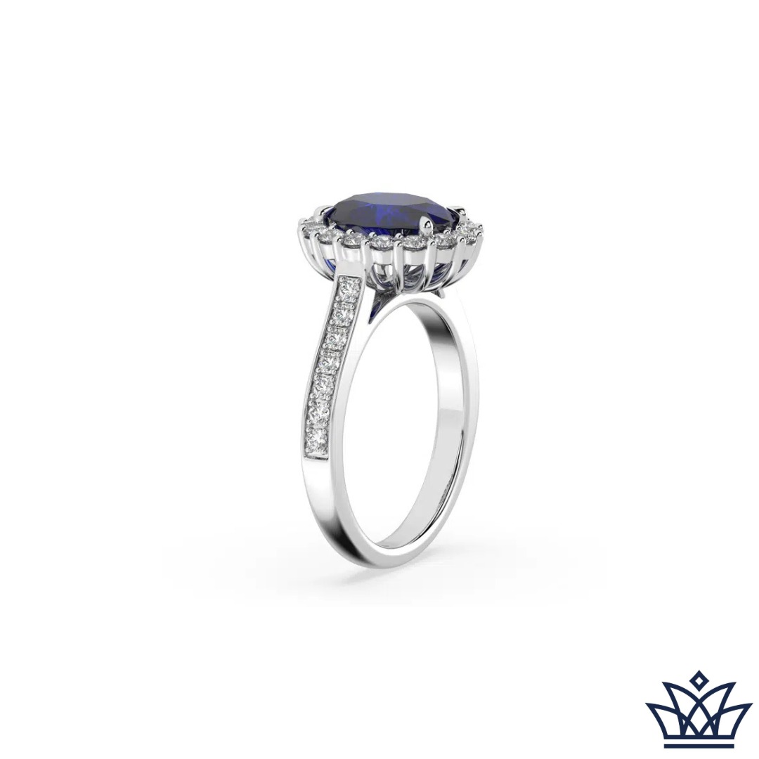 An oval cut Ceylon blue sapphire centre stone. Surrounded by a halo of larger size diamonds to bring out the blue of the sapphire. With diamonds pave set in the band.