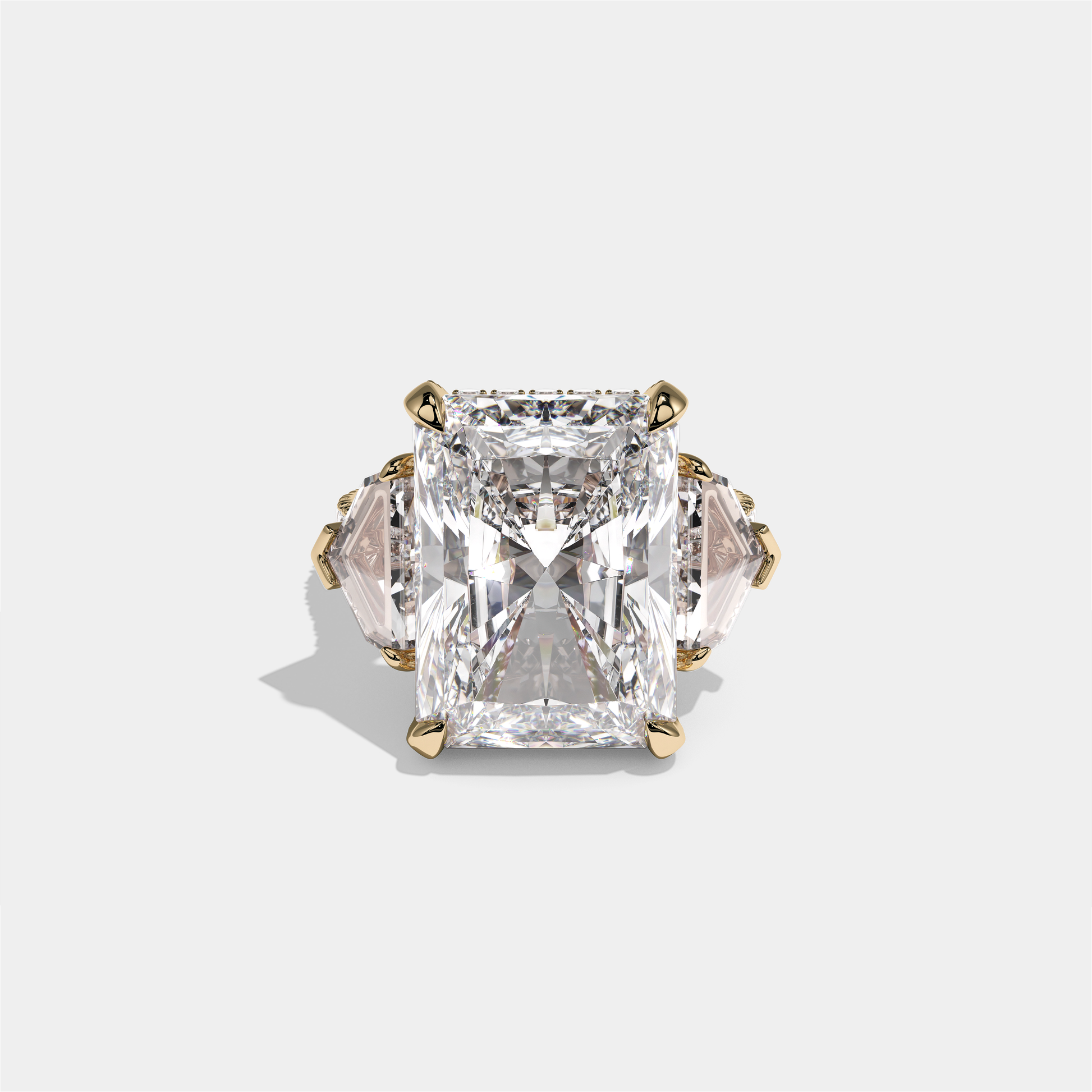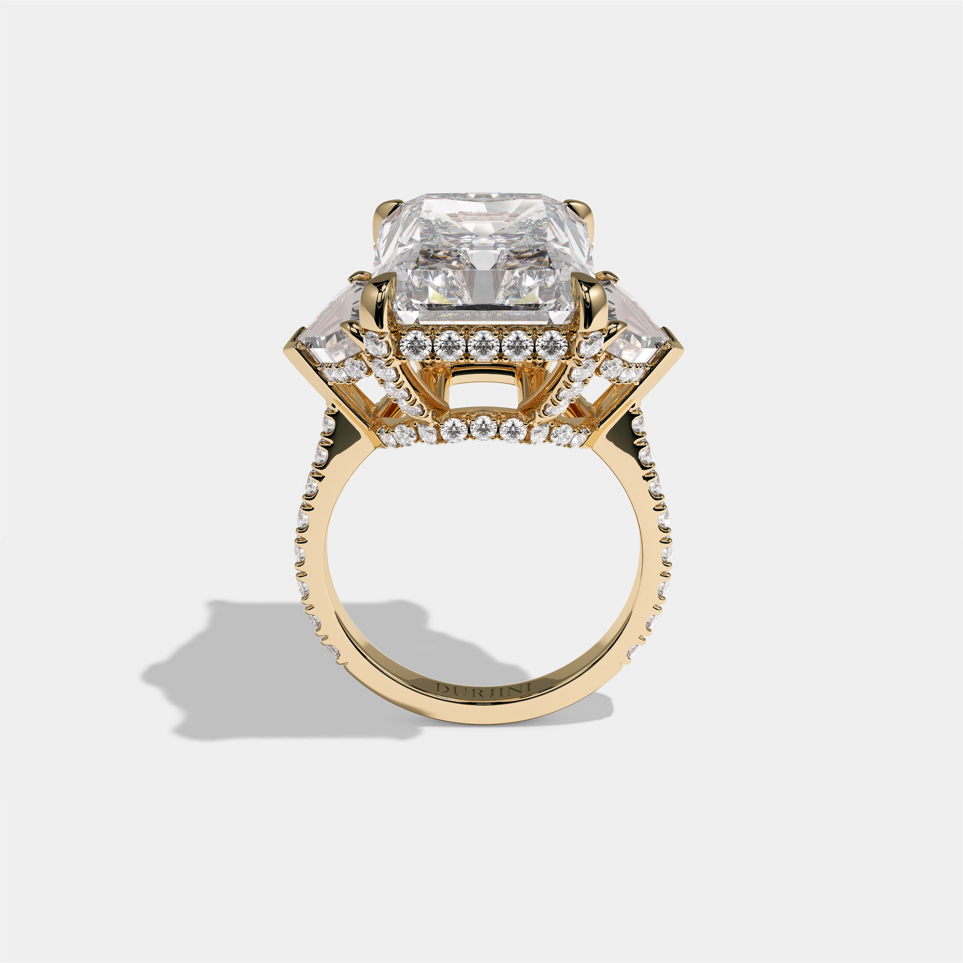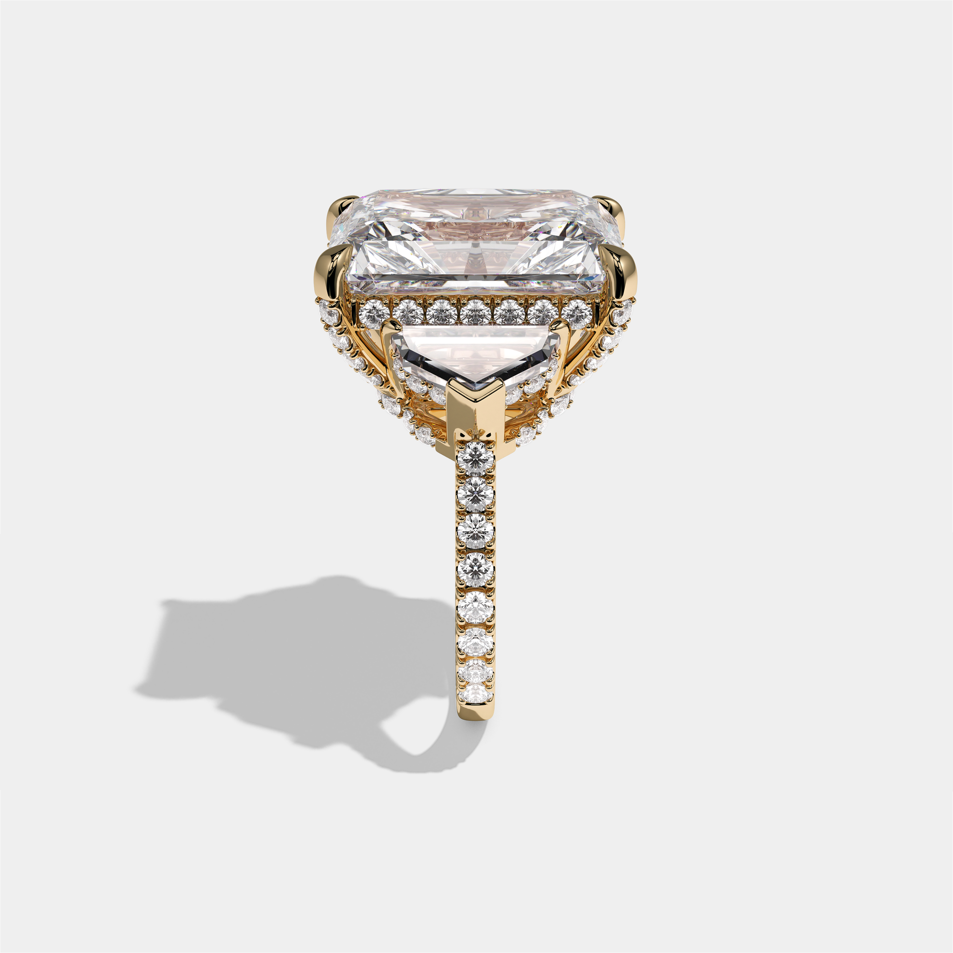 Dinah Lady Fairbourne, the exquisitely composed 12.00 carat total weight Diamond Radiant Halo Engagement Ring in 18K yellow gold, unites the striking geometry of a radiant-cut diamond with the noble warmth of rich gold. A luminous radiant-cut centre stone, encircled by a halo of round brilliant diamonds, is set in glowing yellow gold to create a ring that feels both opulent and gently aristocratic. Worn alone as a golden declaration of love or alongside a curved gold or diamond band, Dinah Lady Fairbourne evokes the quiet grandeur and charm of a modern titled heirloom.