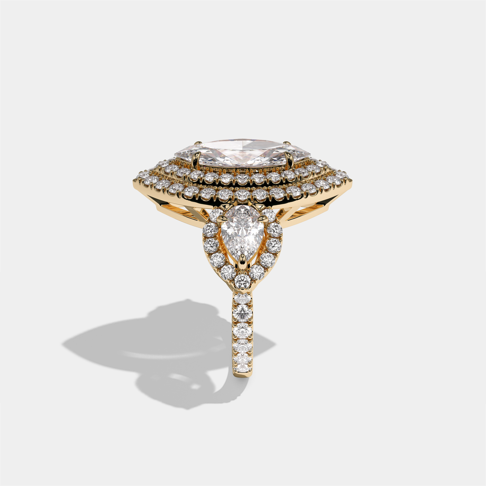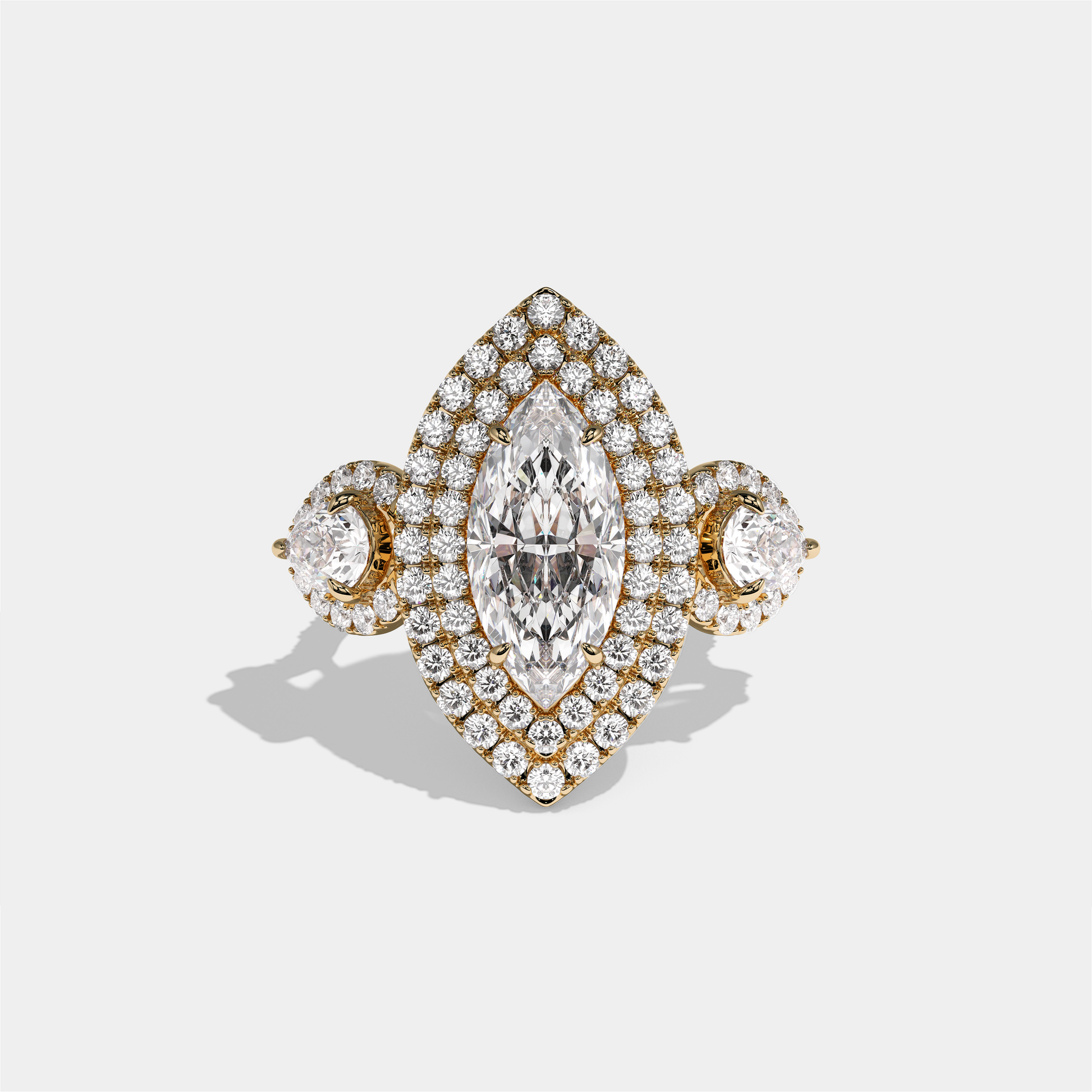 Drusilla Lady Wexford, the exquisitely composed 18.00 carat total weight Diamond Marquise Halo Engagement Ring in 18K yellow gold, unites the dramatic silhouette of a marquise-cut diamond with the noble warmth of rich gold. A luminous marquise-cut centre diamond, encircled by a halo of round brilliant diamonds, is set in glowing yellow gold to create a ring that feels both opulent and gently aristocratic. Worn alone as a golden declaration of love or alongside a curved gold or diamond band, Drusilla Lady Wexford evokes the quiet grandeur and charm of a modern titled heirloom.