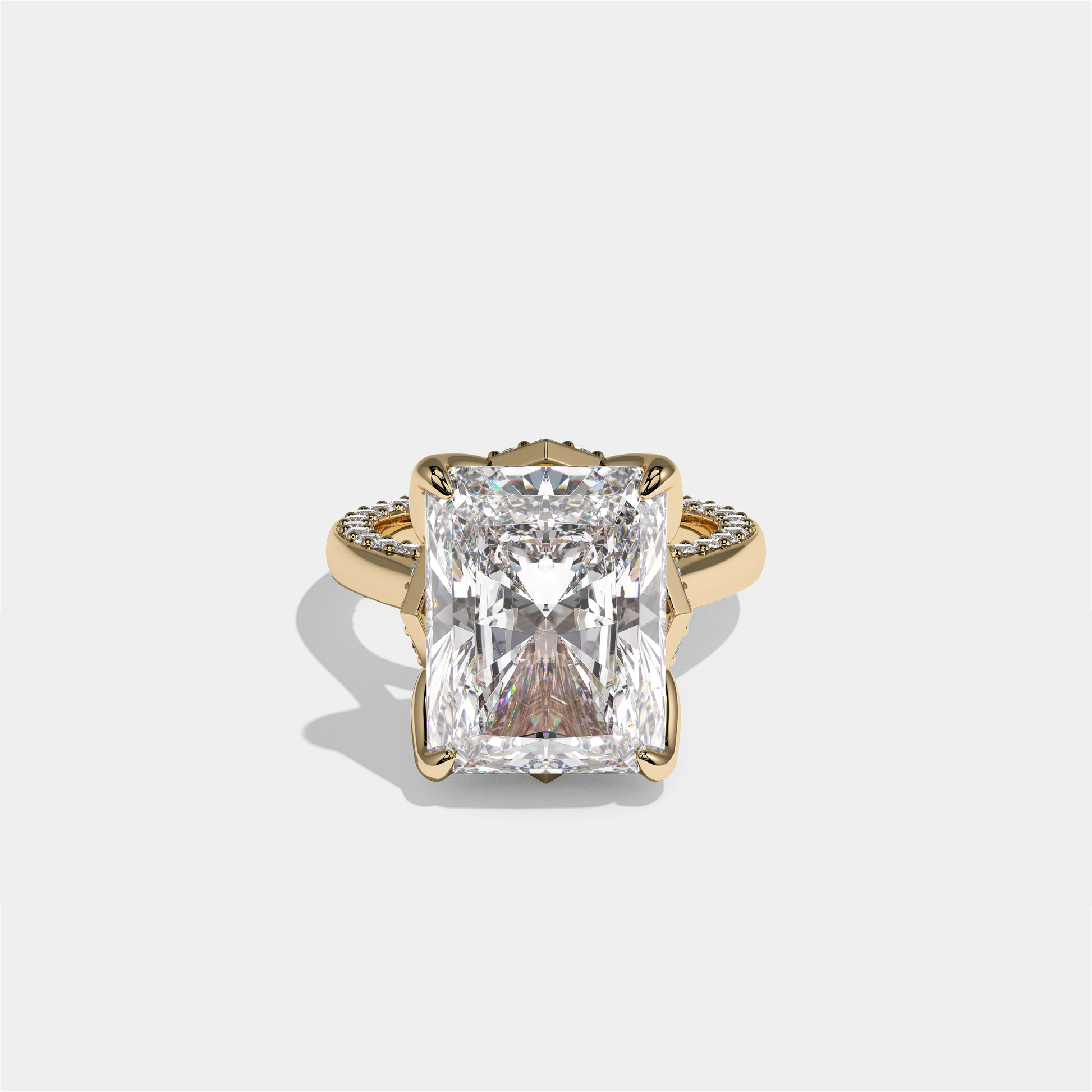 Elisheva Kingswell, the exquisitely composed 10.00 carat total weight Diamond Radiant Halo Engagement Ring in 18K yellow gold, unites the structured elegance of a radiant-cut diamond with the noble warmth of rich gold. A luminous radiant-cut centre stone, encircled by a halo of round brilliant diamonds, is set in glowing yellow gold to create a ring that feels both opulent and regally composed. Worn alone as a golden declaration of love or alongside a slender gold or diamond band, Elisheva Kingswell evokes the quiet grandeur and charm of a modern titled heirloom.