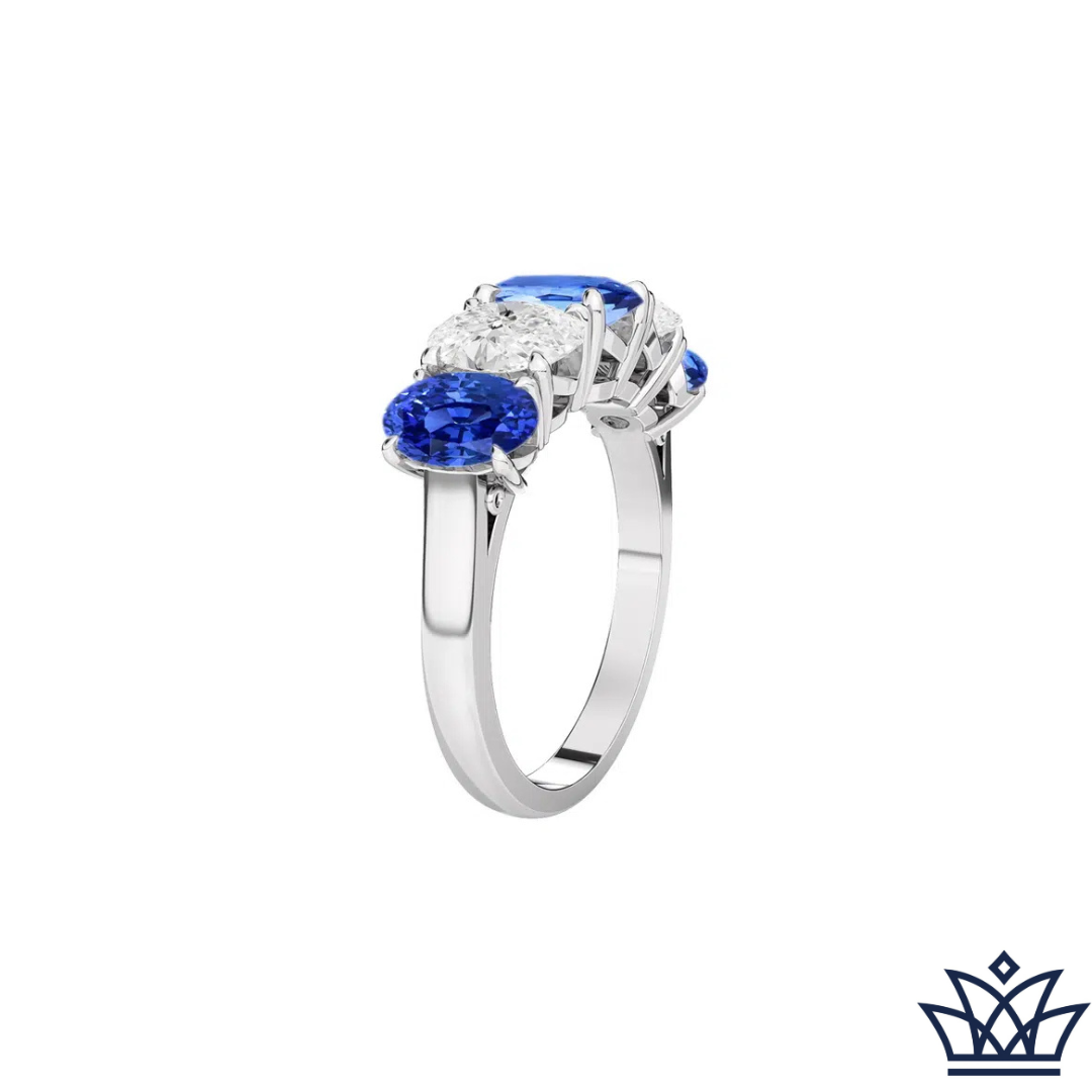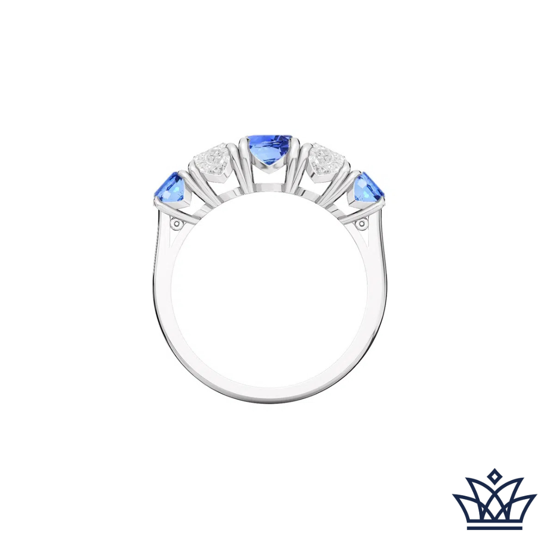 A modern five stone sapphire and diamond ring. Three blue oval shaped sapphires and two oval shaped diamonds set in 18k white gold.