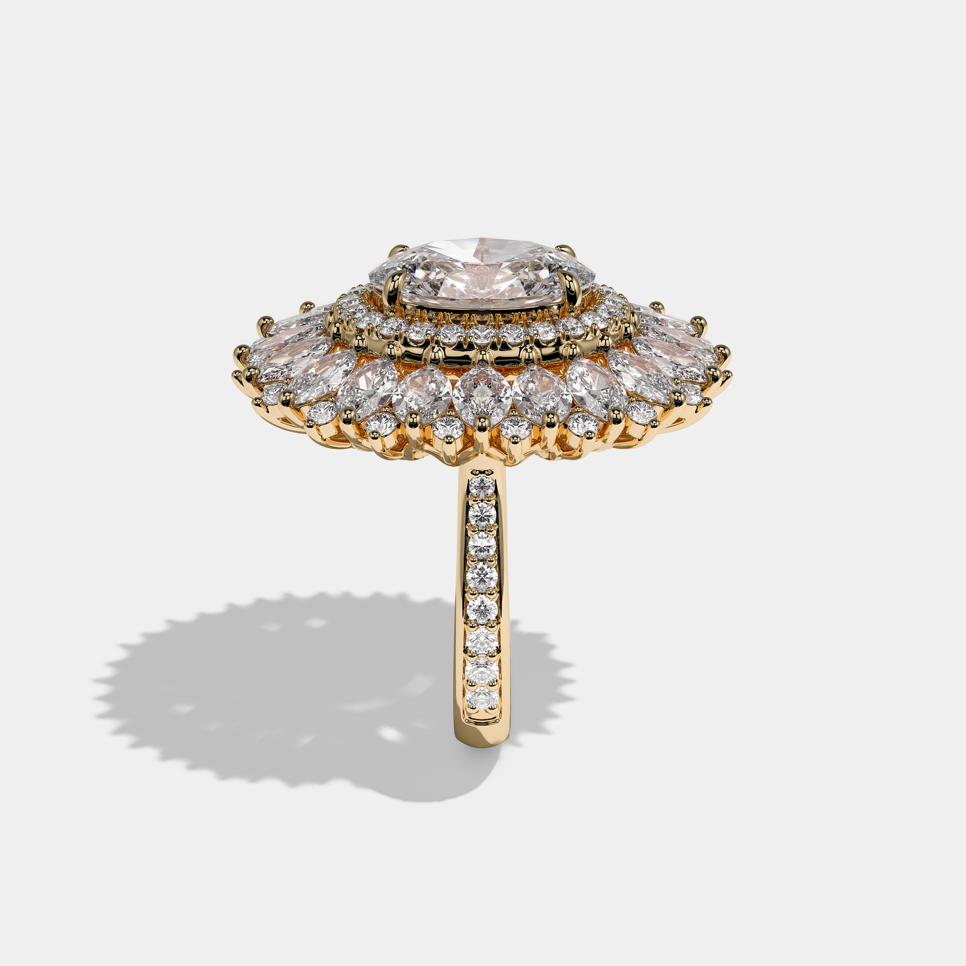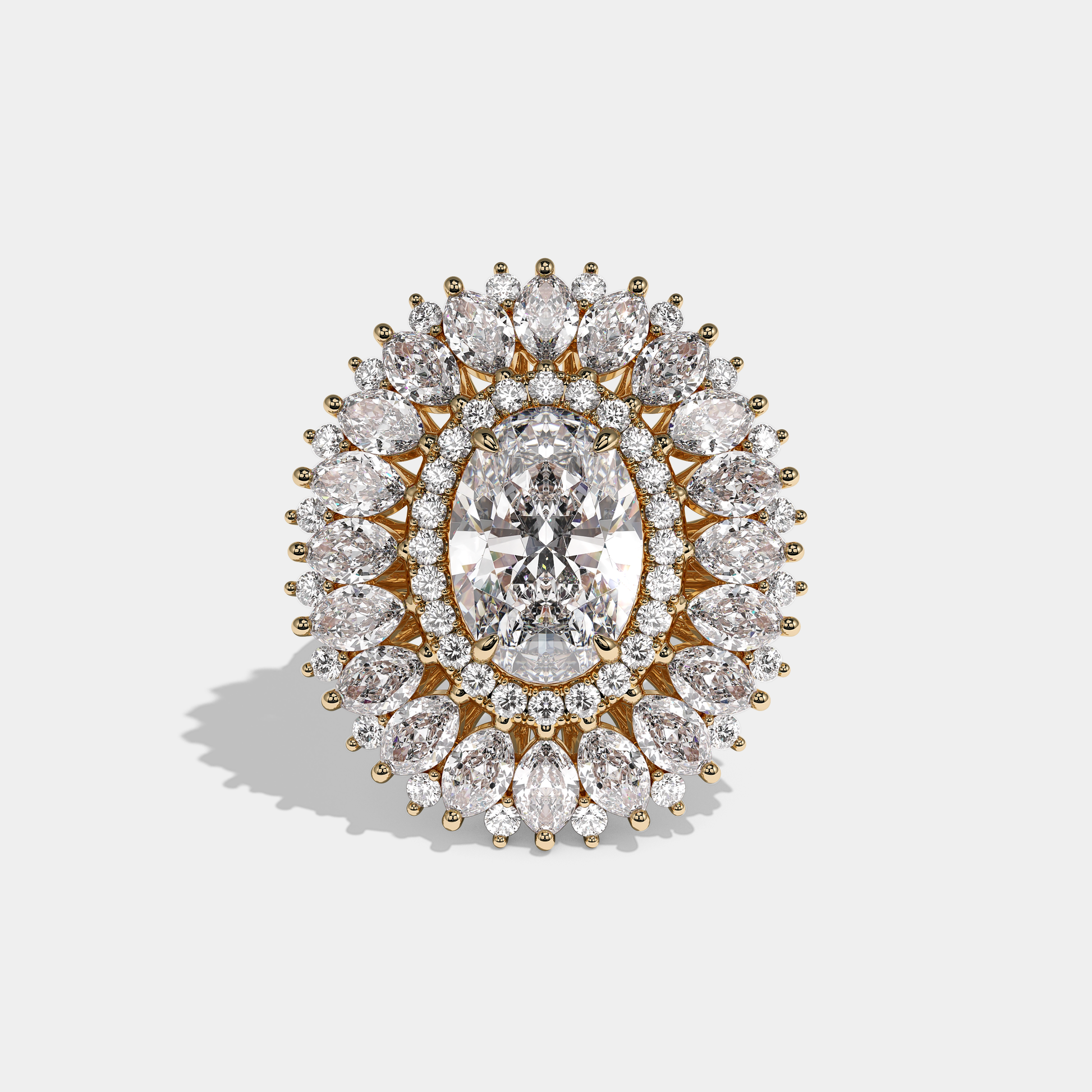 The elongated oval brilliant cut flatters the hand with its graceful proportions, offering a slimming, lengthening effect while releasing a fluid cascade of fire and scintillation. The halo follows and accentuates the stone’s refined silhouette, heightening its visual impact and enhancing light play across every facet. The saturated tone of 18K yellow gold introduces warmth, contrast, and an heirloom character that deepens the richness of the overall design. Perfect for those who dream of a golden engagement ring with storybook grandeur and refined radiance, Florence Royale is a timeless blend of brilliance, elegance, and noble charm.