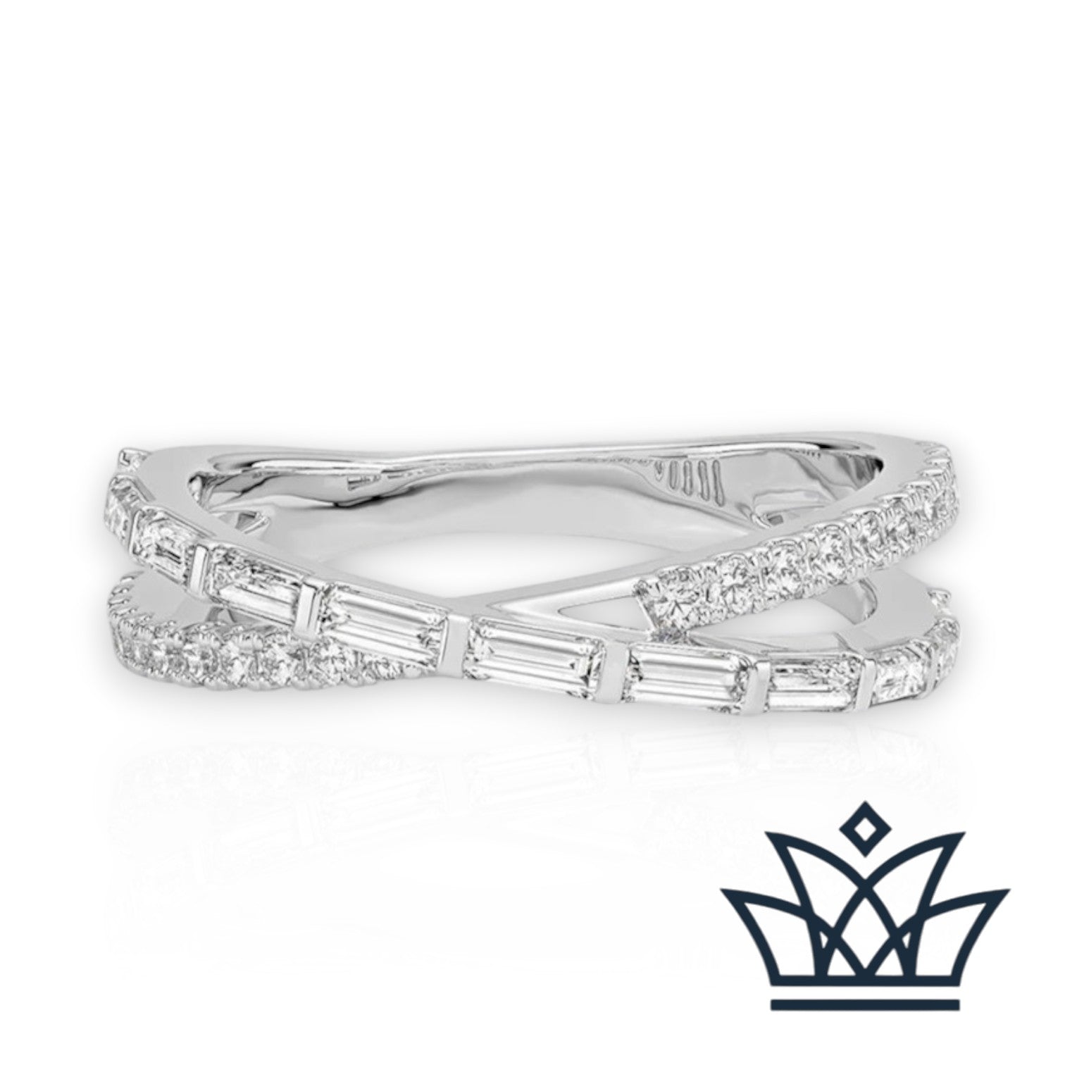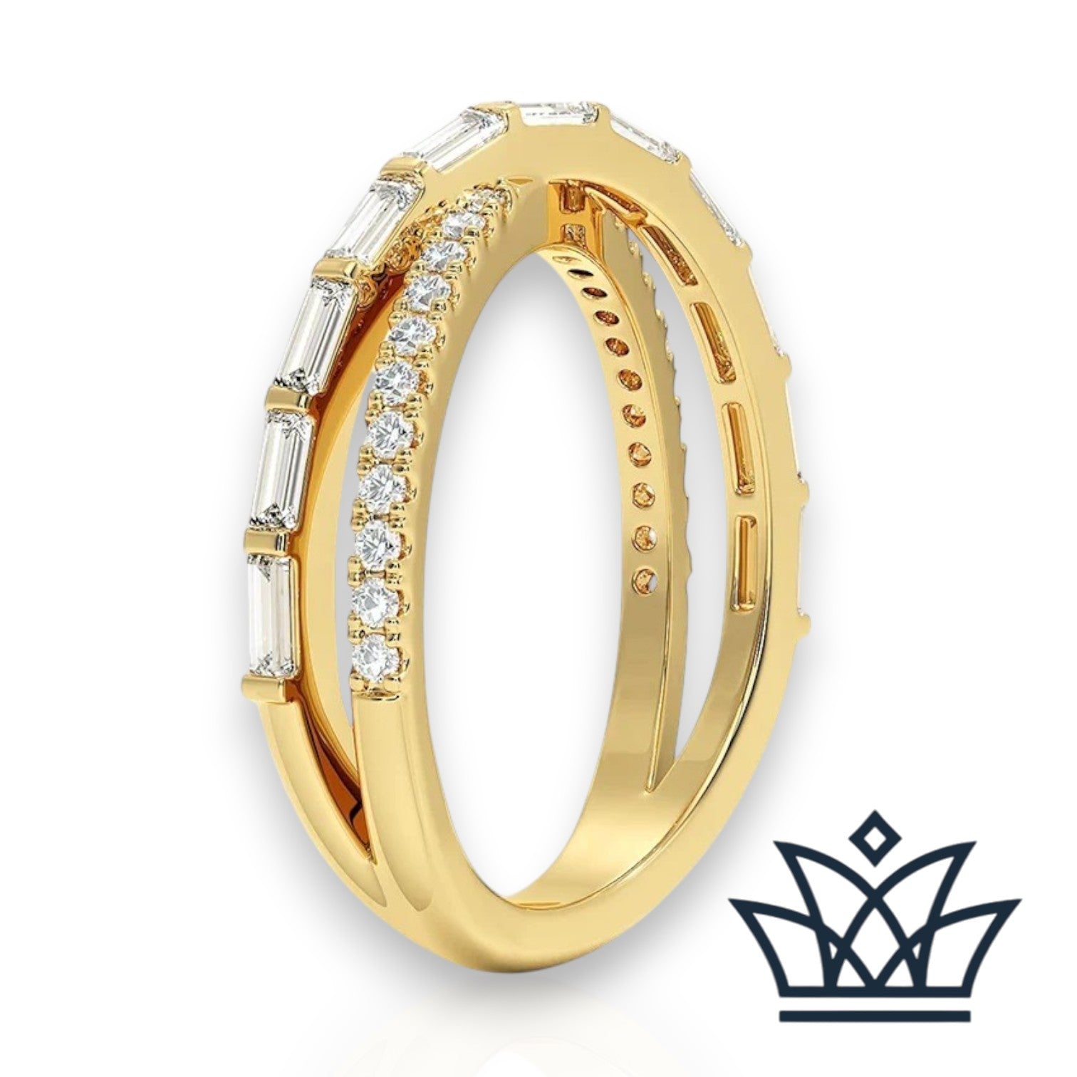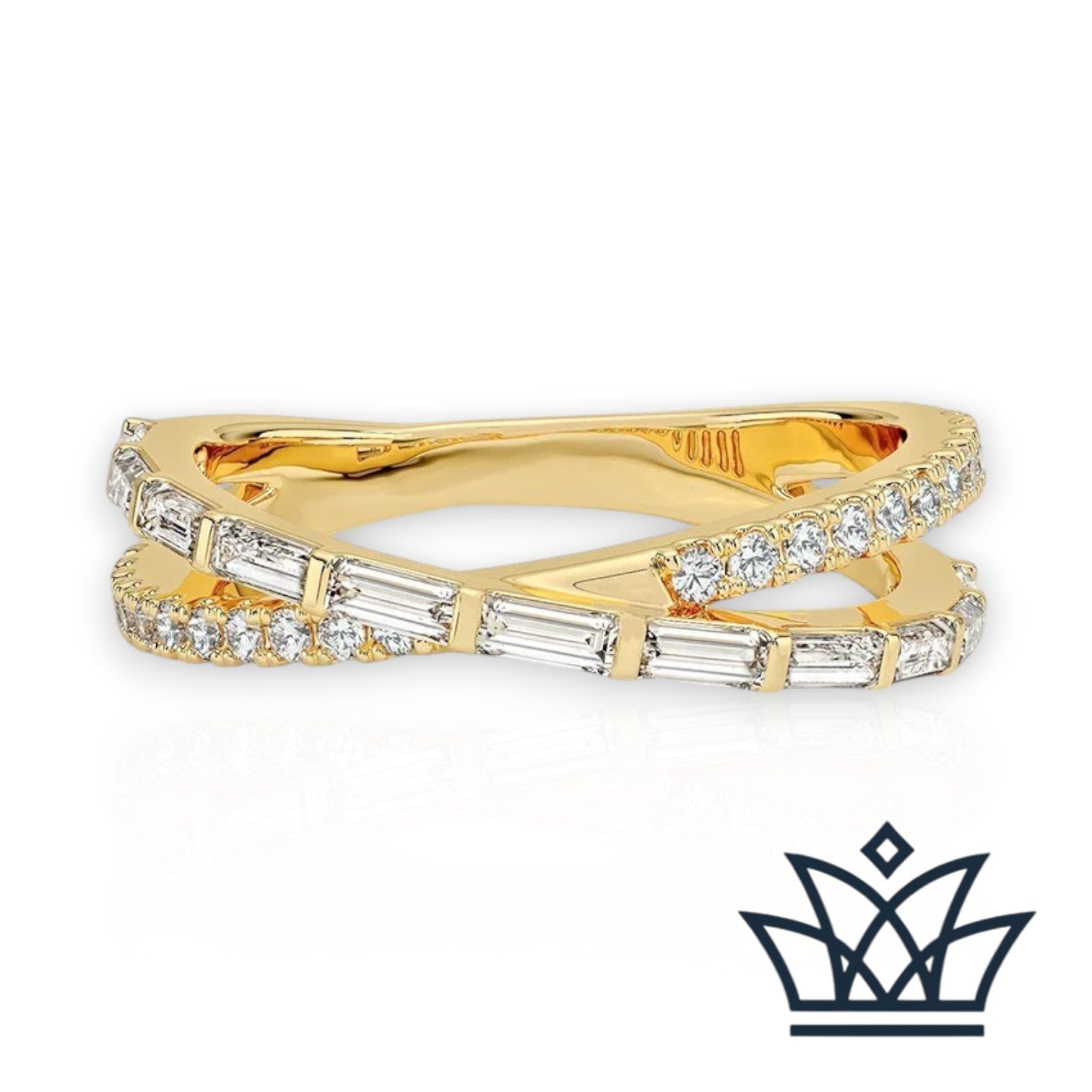 This exquisite crossover ring showcases a harmonious blend of baguette and round lab-grown diamonds, artfully set in 14K yellow gold with a sleek 2.0 mm band. The design features 11 baguette diamonds, totaling 0.35 carats, and 22 round diamonds, totaling 0.18 carats, all prong-set to enhance their brilliance. With F/G color and VS clarity, these ethically crafted diamonds radiate exceptional sparkle, making this ring a stunning symbol of elegance and modern sophistication.