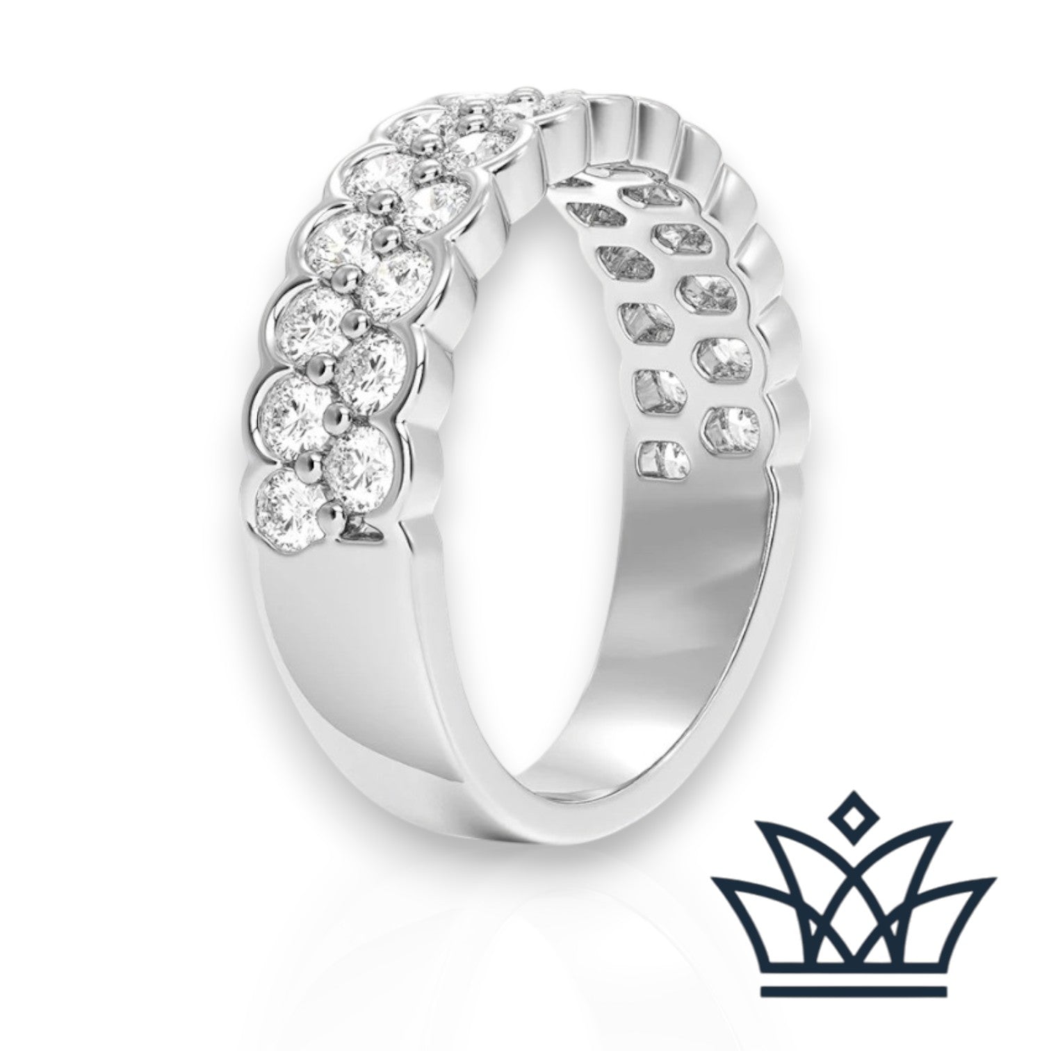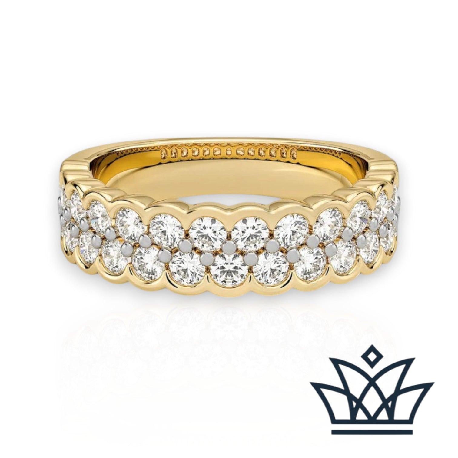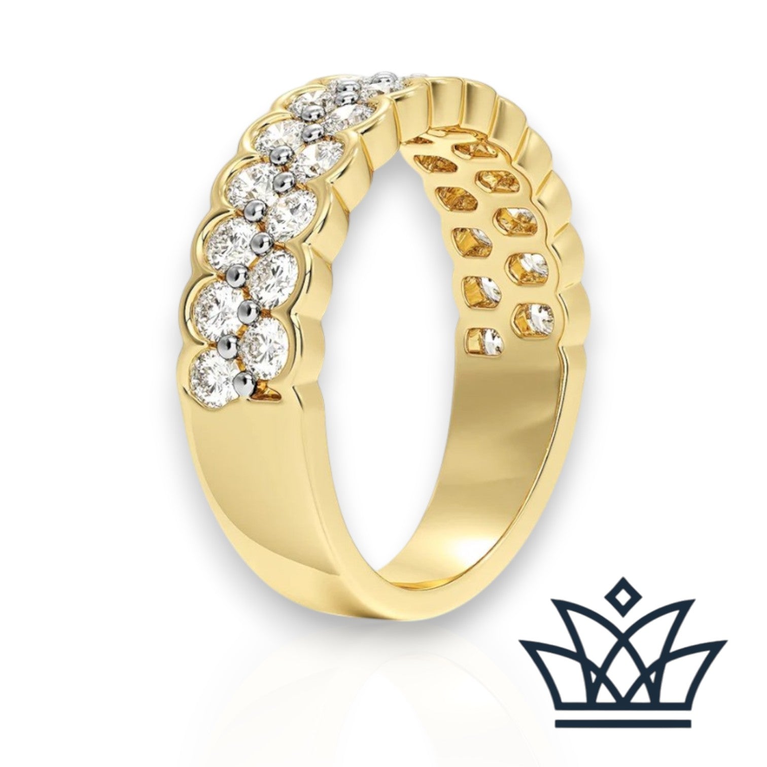 This stunning 18K yellow gold ring features a thick band, with an average width of 3.7 mm. It is adorned with 27 round lab-grown diamonds, with a minimum total carat weight of 0.97 carats. The diamonds are set using a bezel and prong setting, ensuring both style and security. With an average color rating of F/G and a VS1 clarity, these diamonds provide a beautiful, bright sparkle, making this ring a striking piece for any occasion.