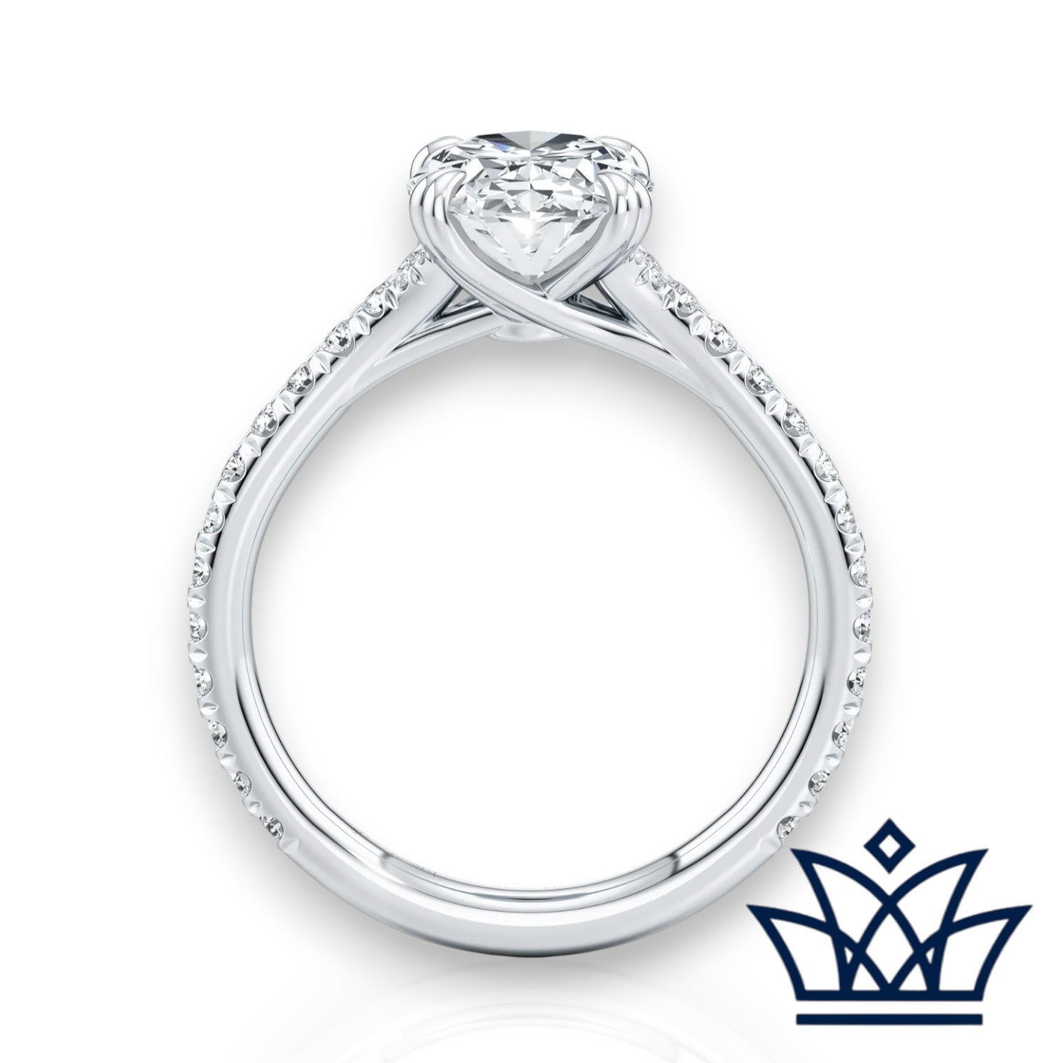 Crafted with graceful precision and dimensional artistry, L’Étoile Solitaire is a radiant symbol of enduring love. This signature design showcases a luminous oval lab-grown diamond, secured by elegant double prongs that offer stunning views from every angle. The 18k white gold band is delicately adorned with a single row of round brilliant pavé-set lab diamonds, adding a refined sparkle without overshadowing the centerpiece.