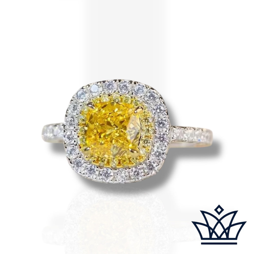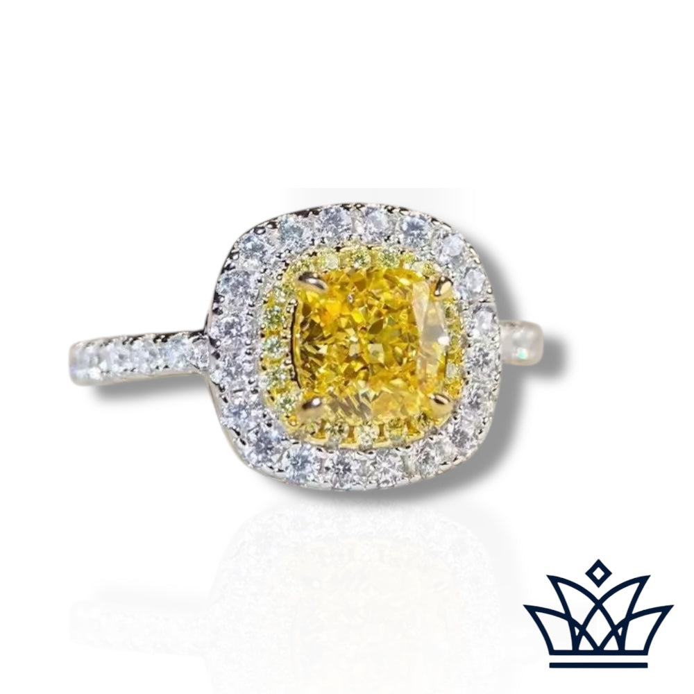 An ode to timeless elegance, Lueur Royale captivates with its majestic allure. At its heart lies a dazzling cushion-cut yellow diamond, bathed in warmth and brilliance — a true symbol of opulence. Encircled by a double halo of radiant white and yellow diamonds, the ring evokes the glow of royalty, where light dances with every movement. Set upon a delicate band of pavé diamonds, this piece embodies grace, sophistication, and the enduring charm of French luxury.