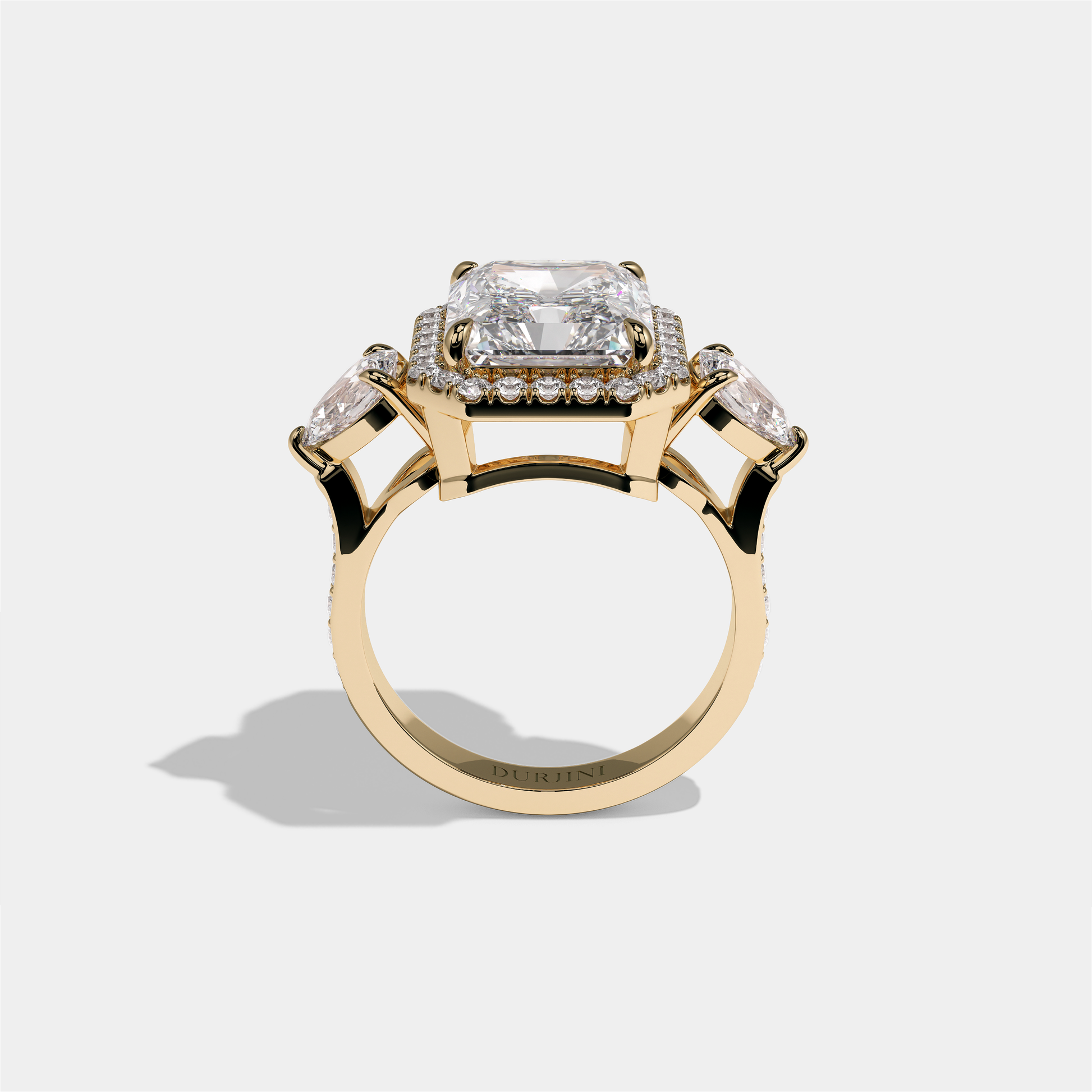 Marian Viscountess Letitia, the exquisitely composed 15.00 carat total weight Diamond Radiant Halo Engagement Ring in 18K yellow gold, unites the bold geometry of a radiant-cut diamond with the noble warmth of rich gold. A luminous radiant-cut centre diamond, encircled by a halo of round brilliant diamonds, is set in glowing yellow gold to create a ring that feels both opulent and gently aristocratic. Worn alone as a golden statement or alongside a curved gold or diamond band, Marian Viscountess Letitia evokes the quiet grandeur and charm of a modern titled heirloom.