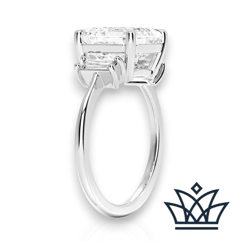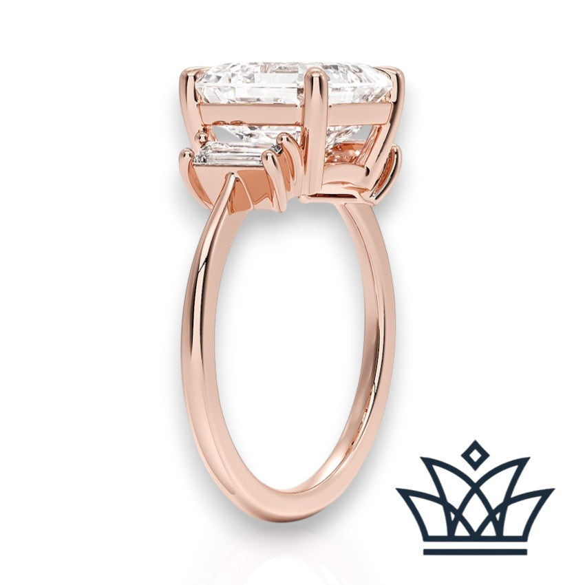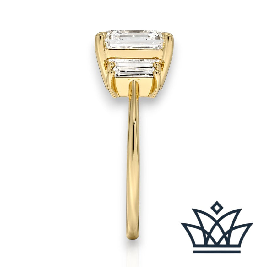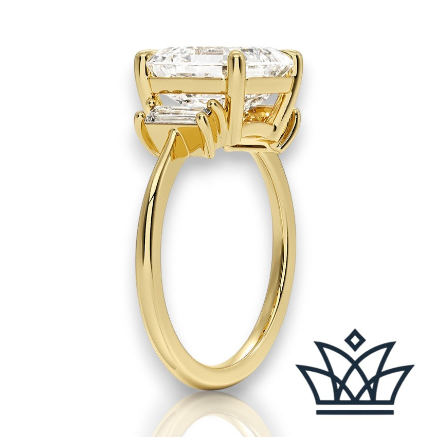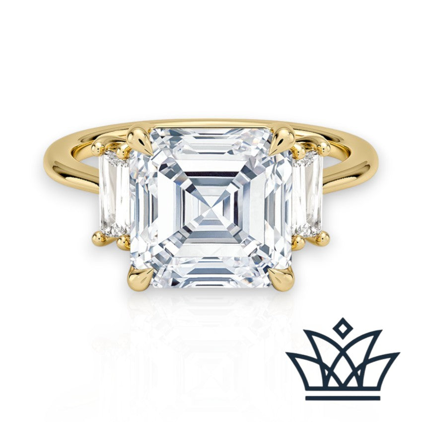 Experience the allure of the Asscher cut with this breathtaking 18k gold ring. Featuring a magnificent 5-carat Asscher-cut diamond at its heart, this piece is accentuated by two 0.5-carat baguette diamonds on either side. The combination of the unique cut and the rich gold band creates a piece of timeless elegance and sophistication.