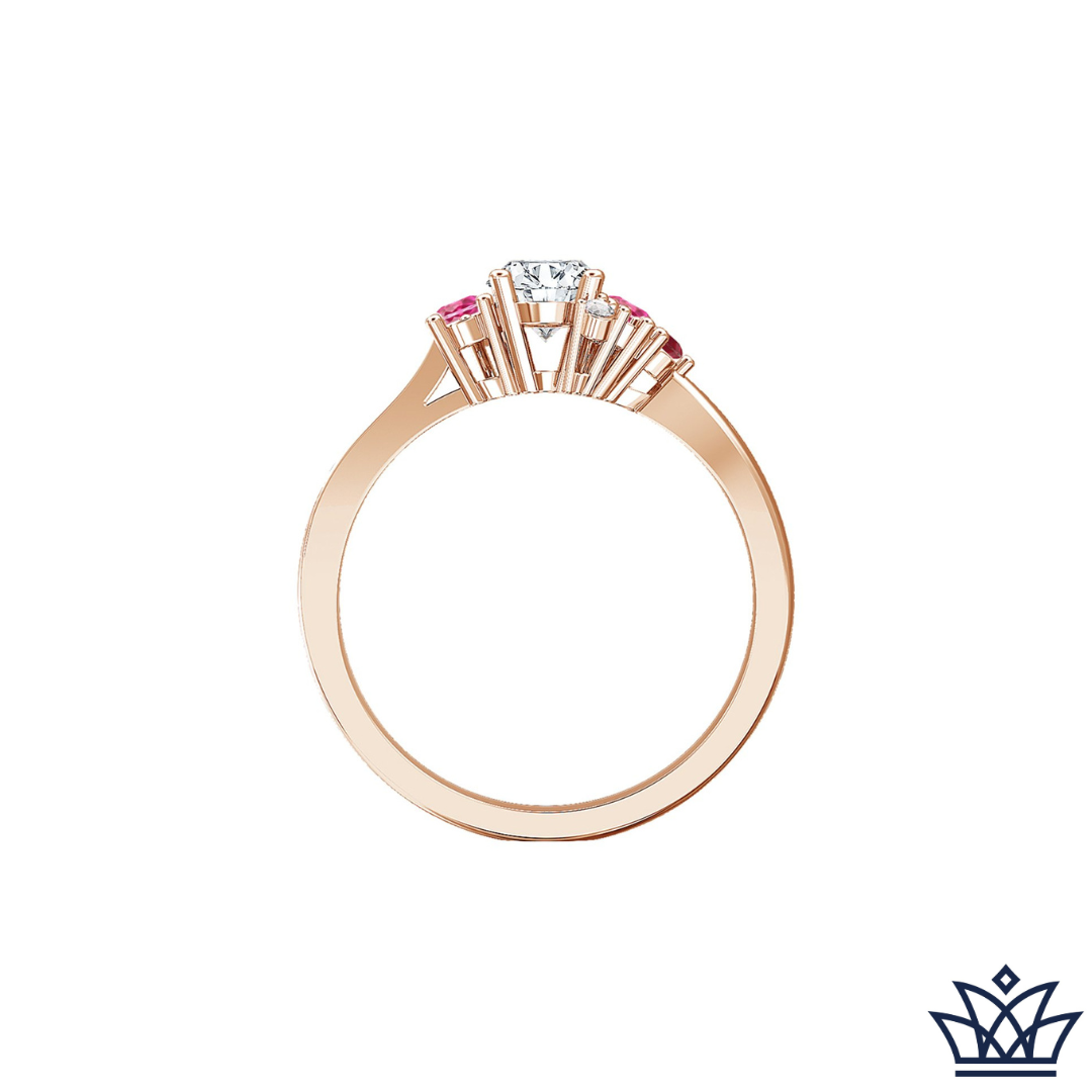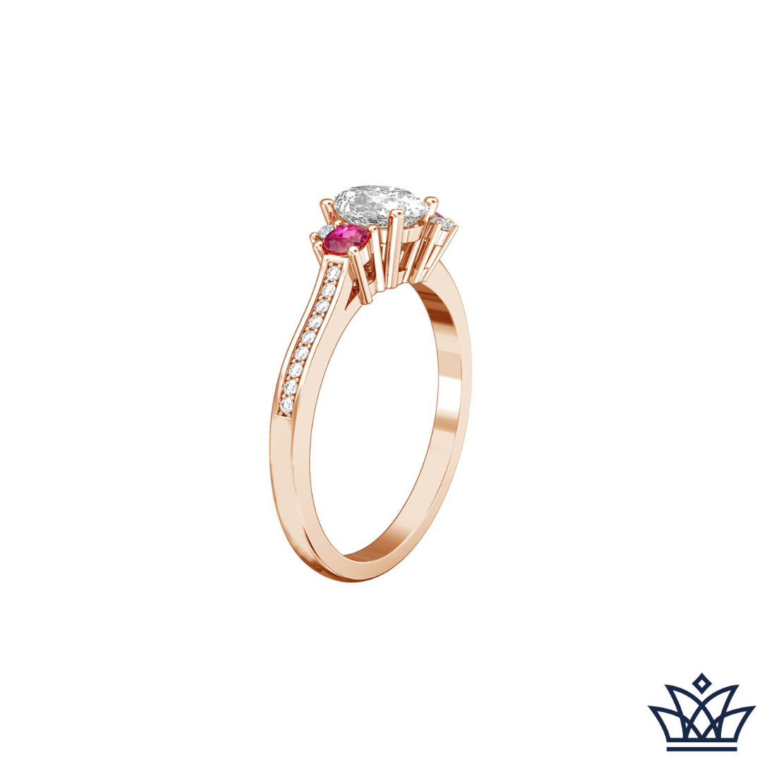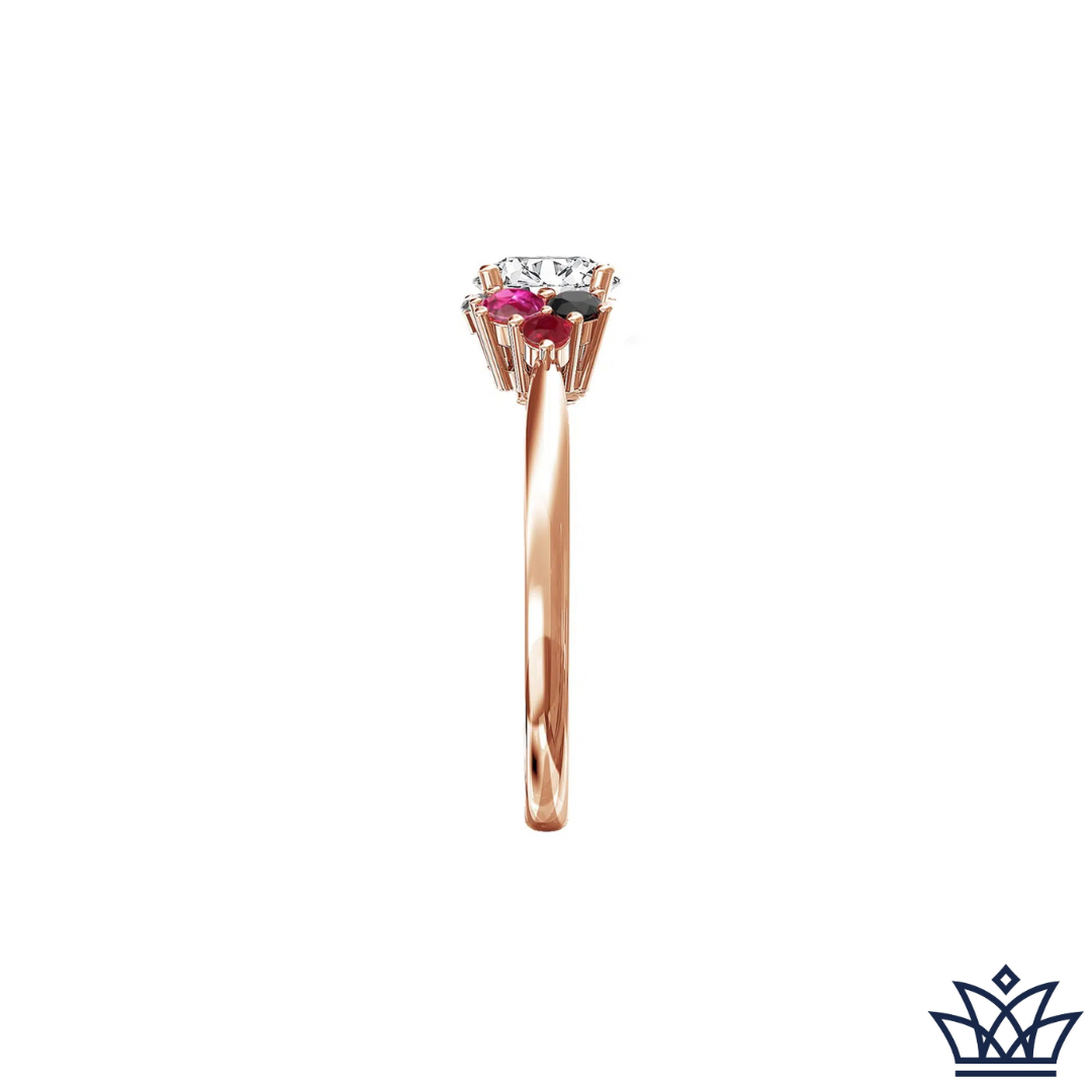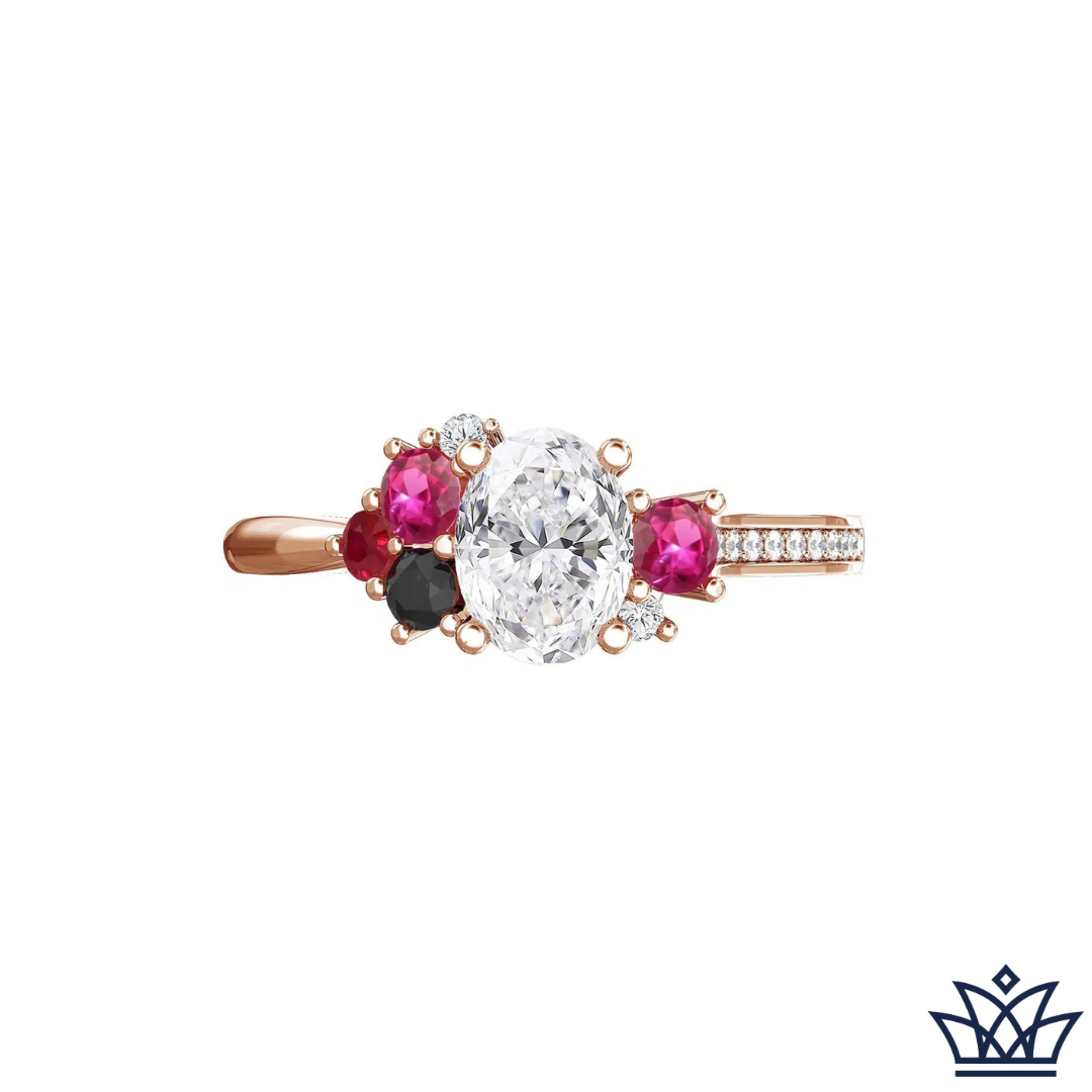 This asymmetrical custom-designed engagement ring, features an oval diamond. The center stone is flanked with sapphires, rubies and black diamond accents. The 18Ct rose gold metal finish, complements the dainty colours of the precious gems. A very unique and eye-catching design.