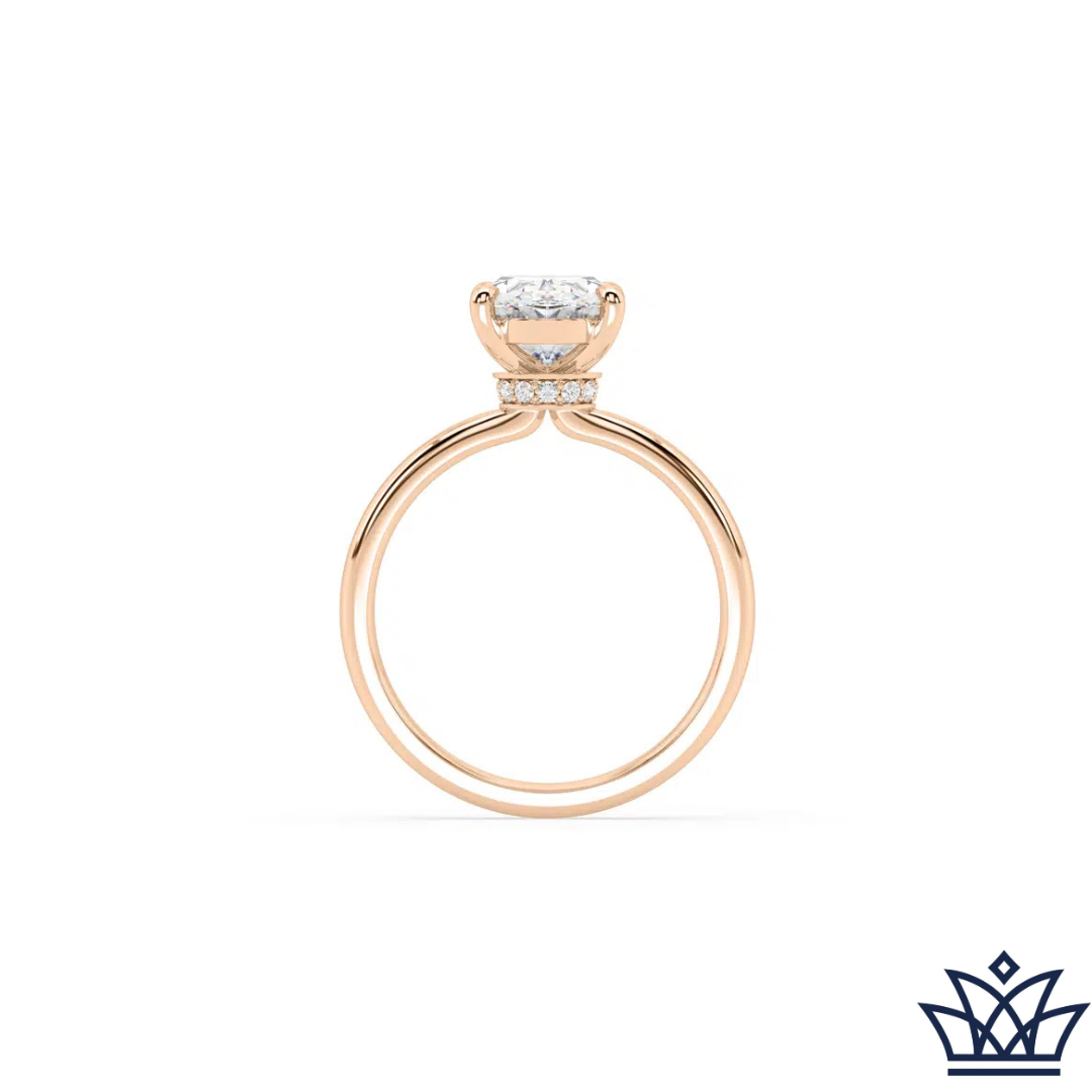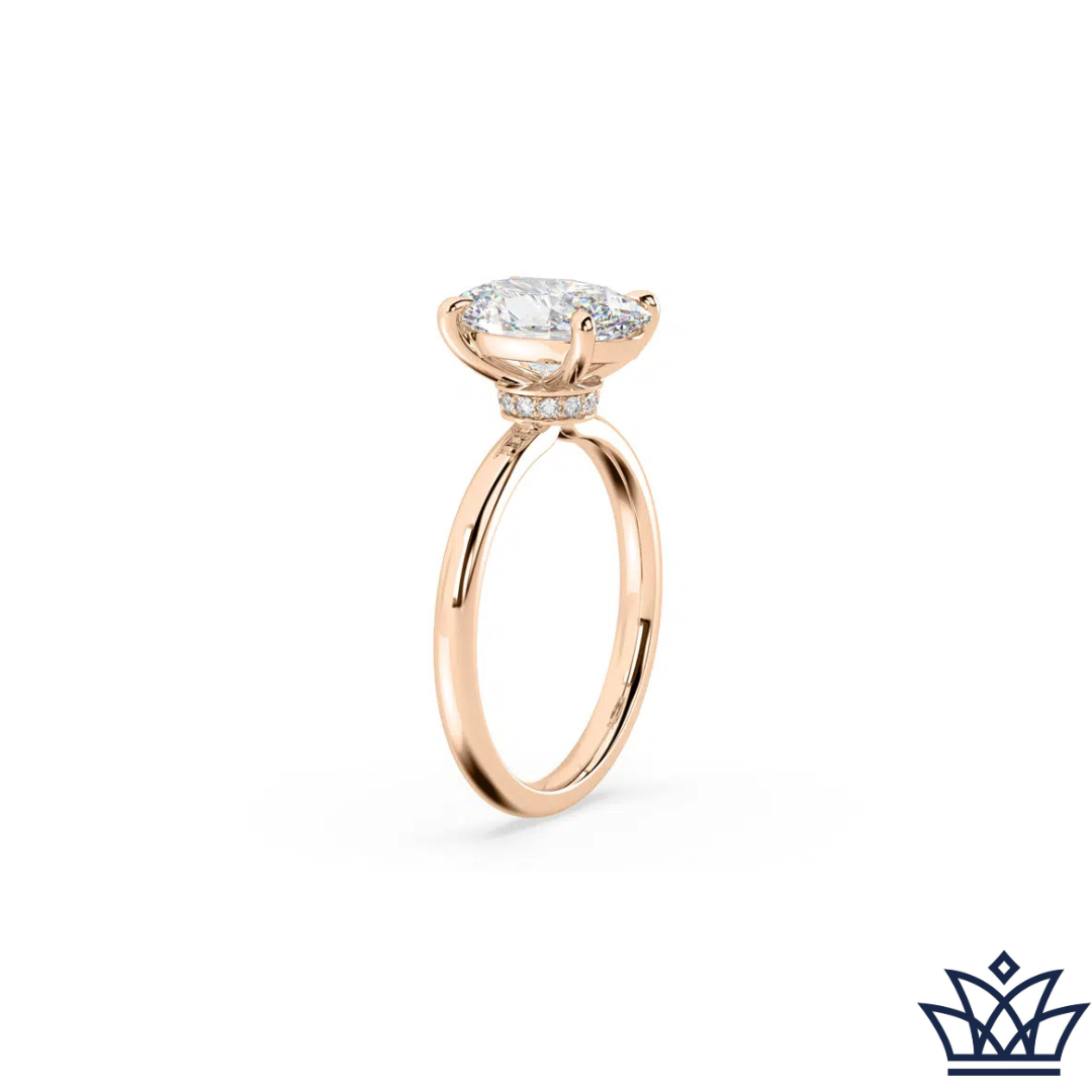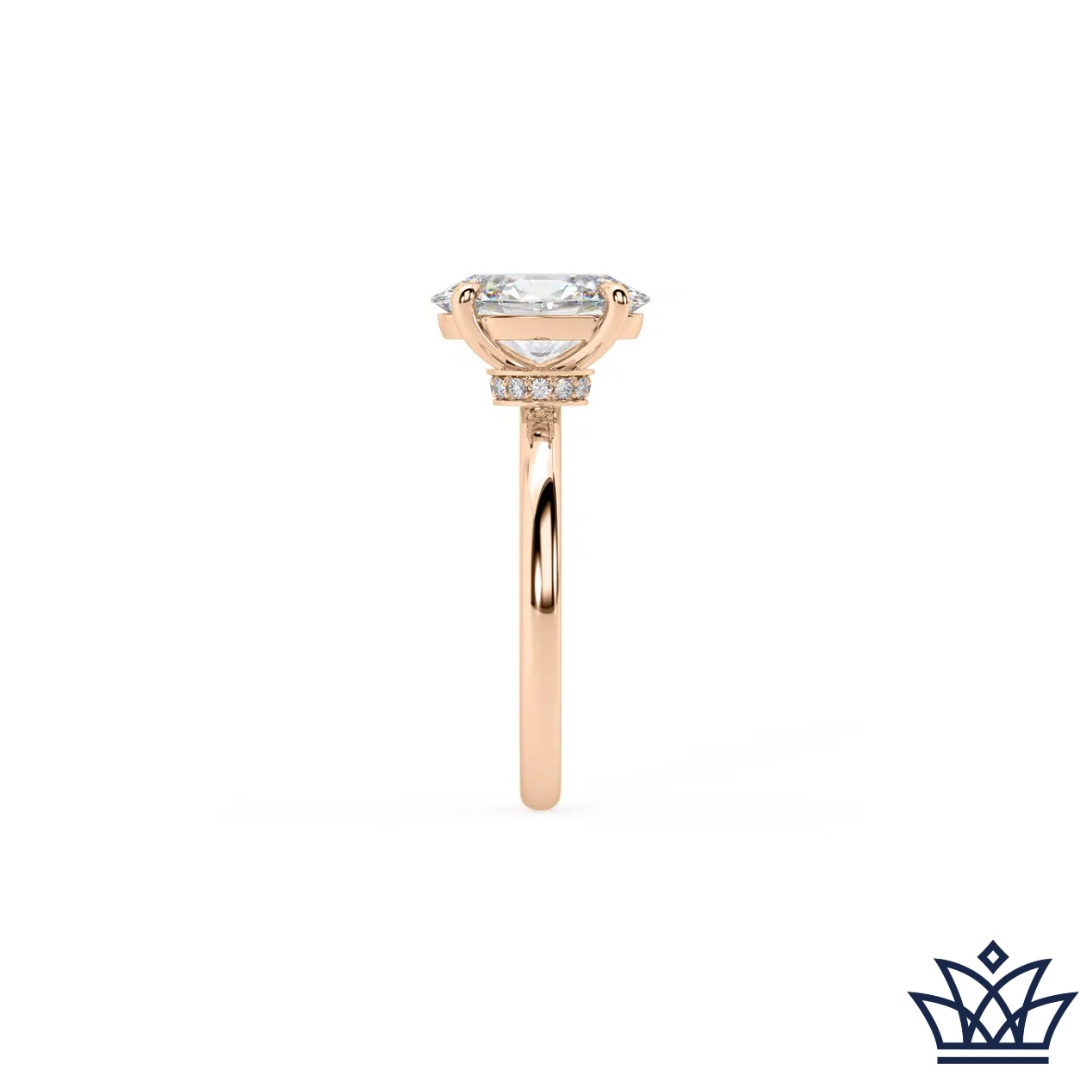 A custom-made classic engagement ring showcasing a solitaire oval-cut diamond with a hidden halo design. The diamond halo encircles the base of the claws, adding a touch of elegance and brilliance to the 18k rose gold setting. A timeless and sophisticated choice for celebrating everlasting love and commitment.