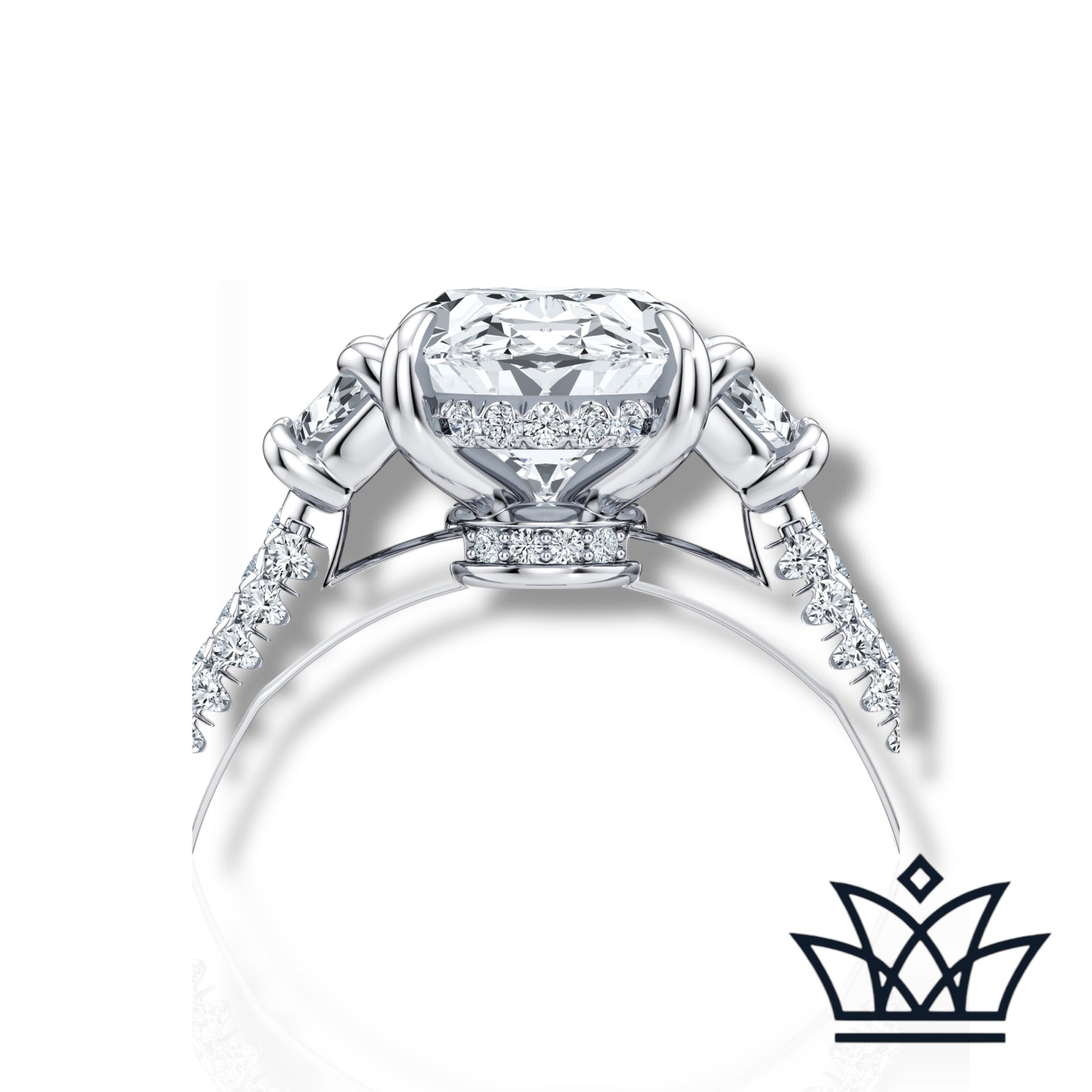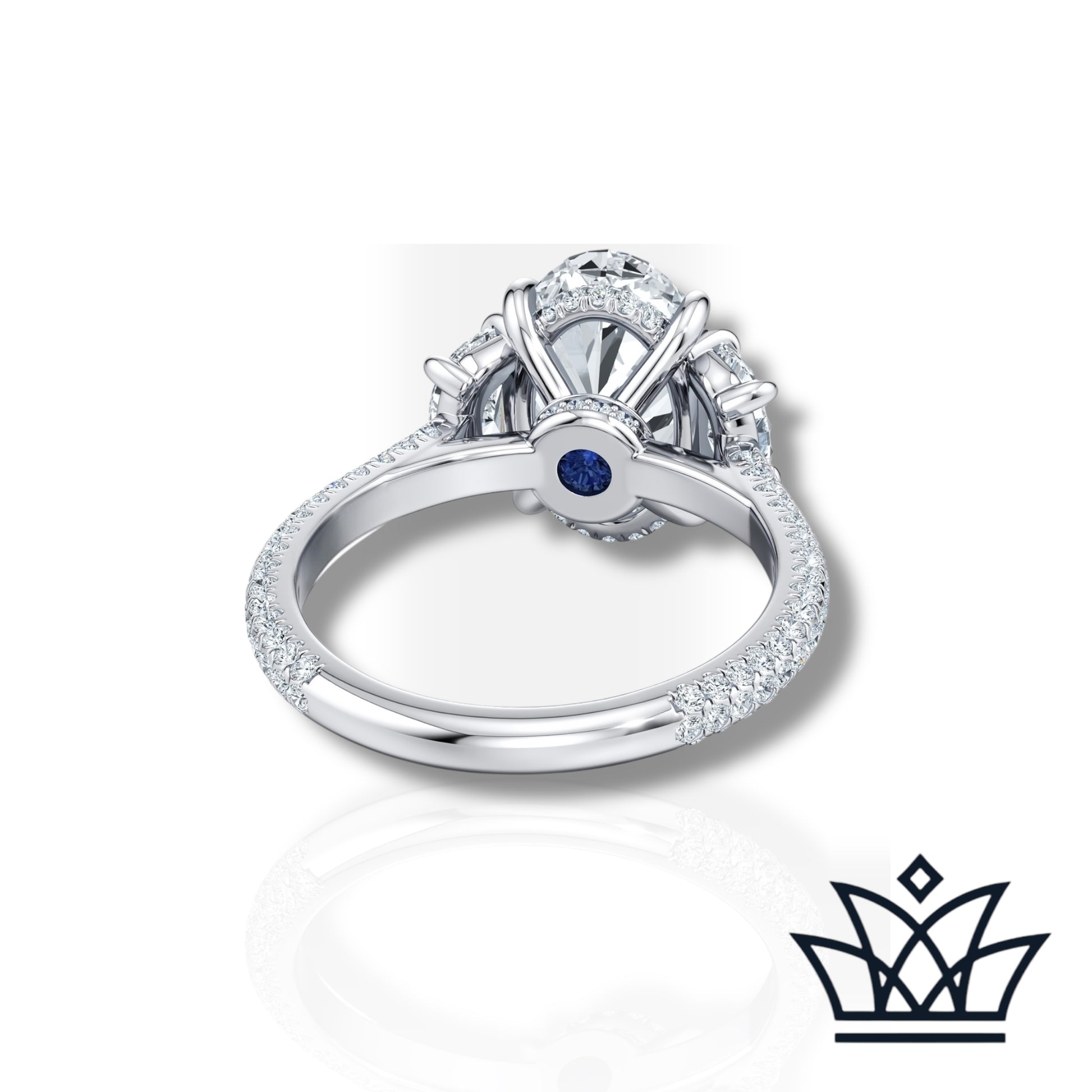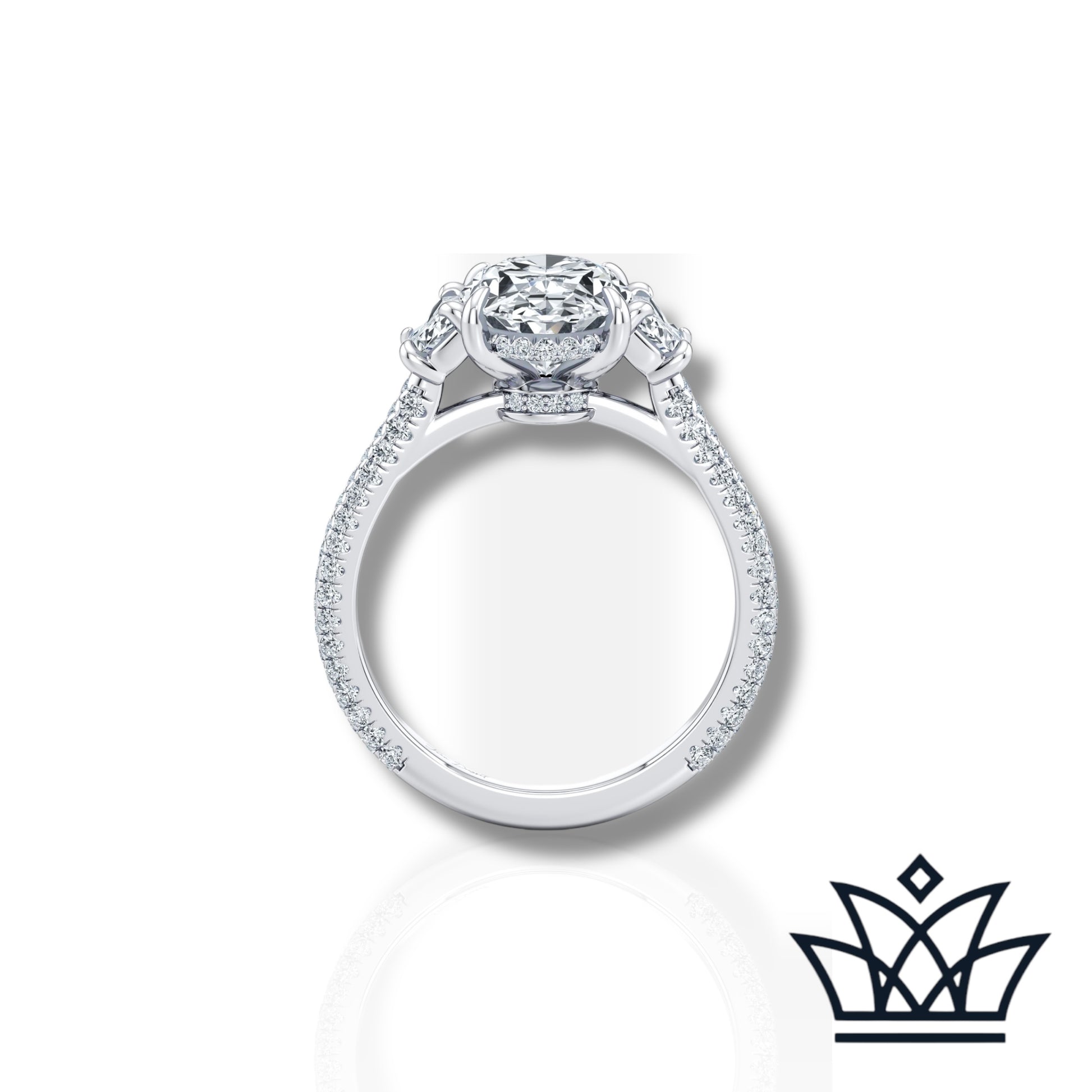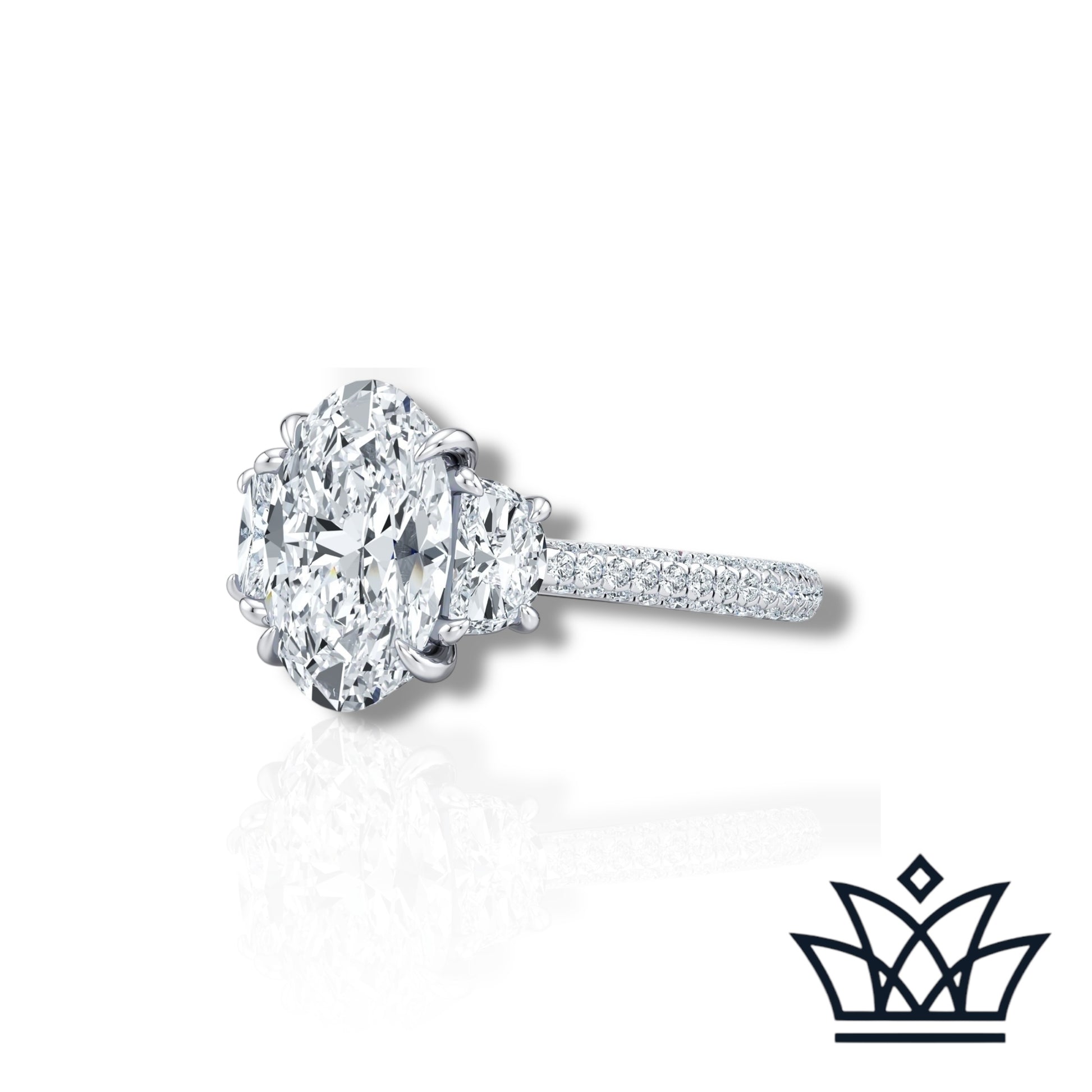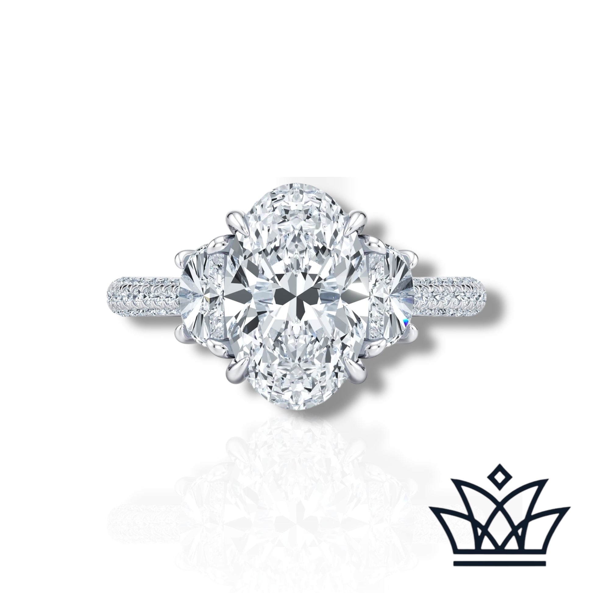 Celebrate eternal elegance with The Solène Ring by Diamandor by Hana. At its center shines a mesmerizing 3-carat oval lab-grown diamond, masterfully cut to capture light from every angle. Two exquisite 0.5-carat half-moon side stones cradle the center diamond, creating a harmonious three-stone silhouette that symbolizes your past, present, and future. Set on a pavé diamond band, this ring radiates timeless beauty with a modern, sustainable heart. A statement of love, grace, and brilliance—forever yours.