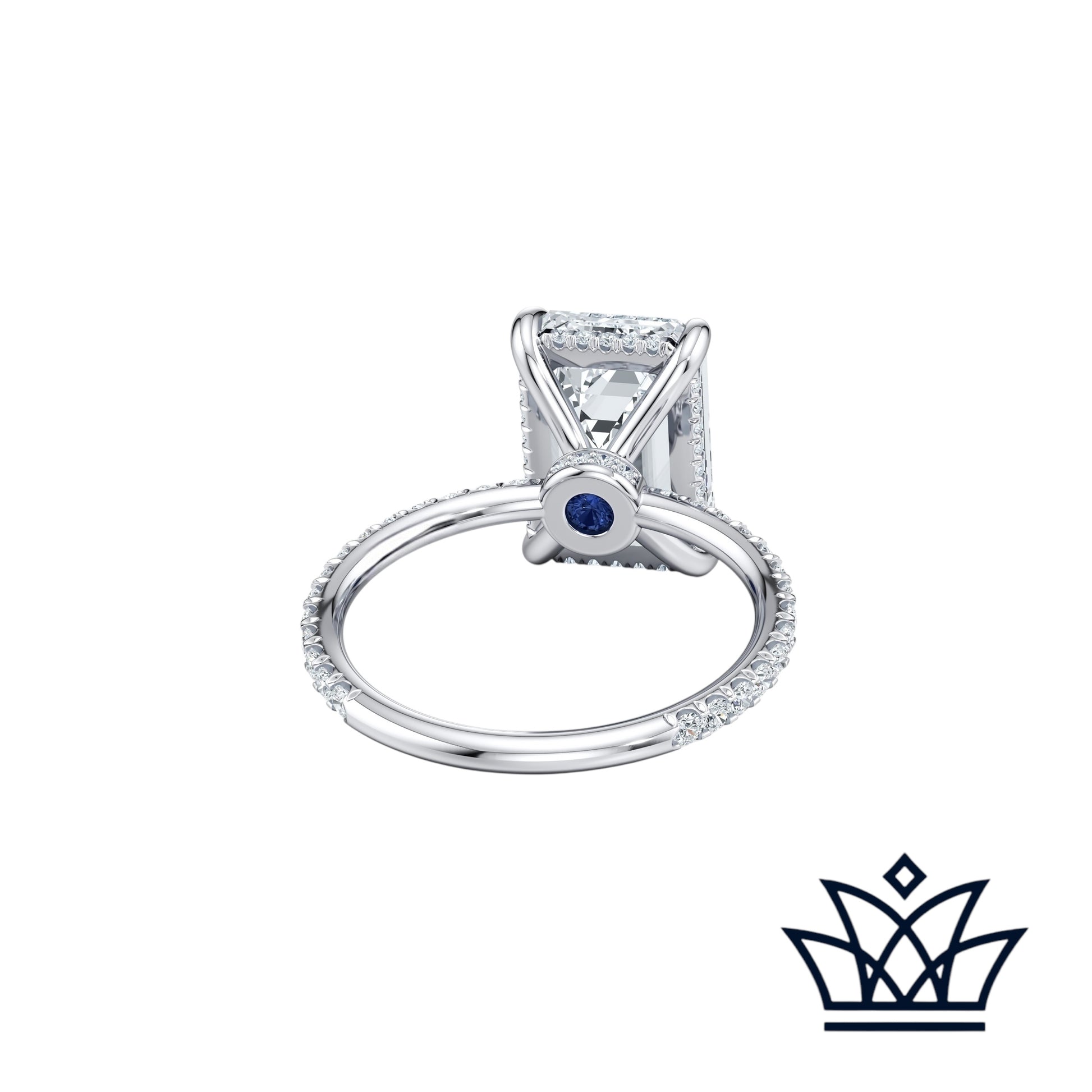 The signature pavé setting is enhanced by 59 round lab diamonds, delicately lining the bridge and gallery to form a hidden halo—amplifying sparkle from every angle. Set in 18k white gold, the 2mm aerial band offers a sleek, contemporary profile that complements the bold geometry of the center stone.