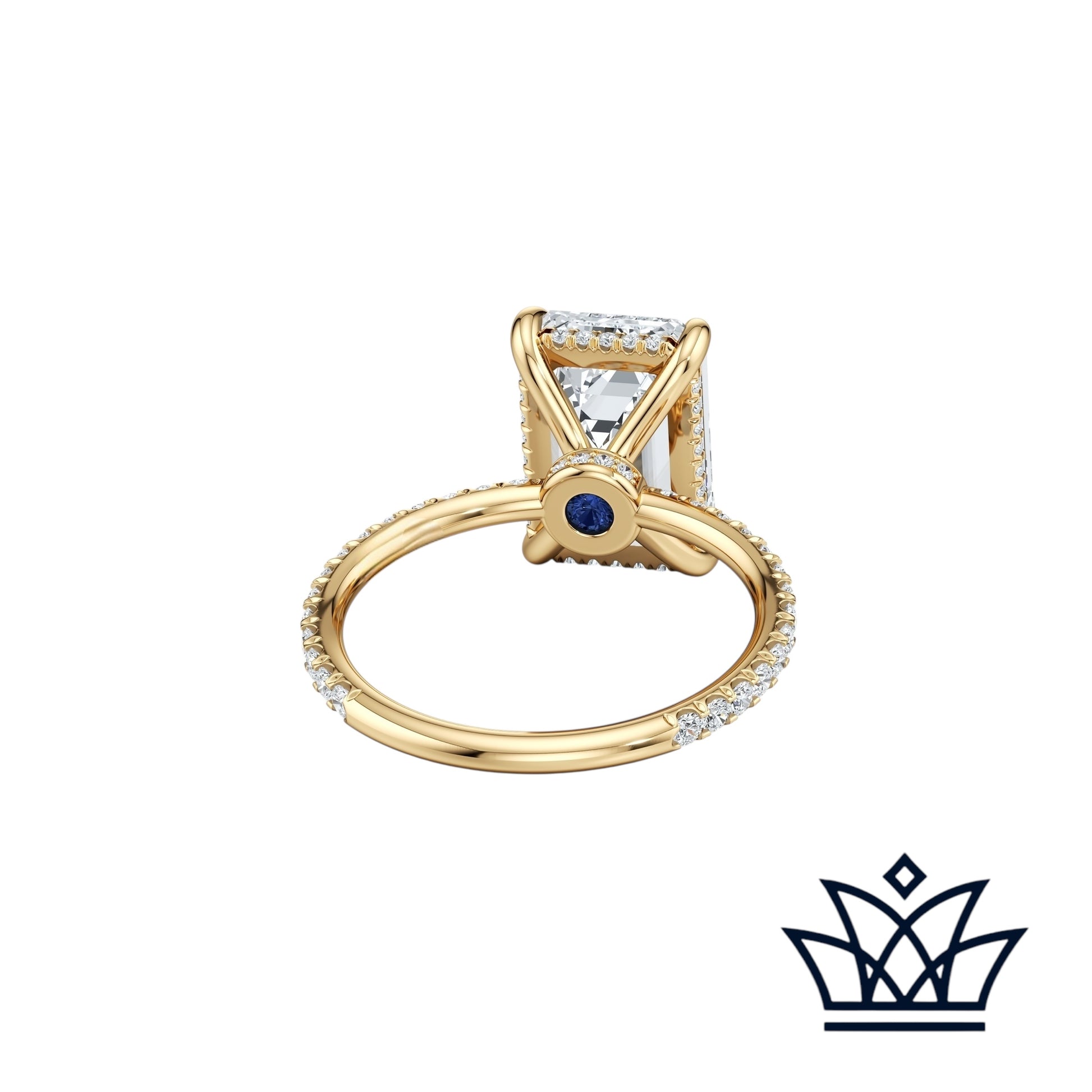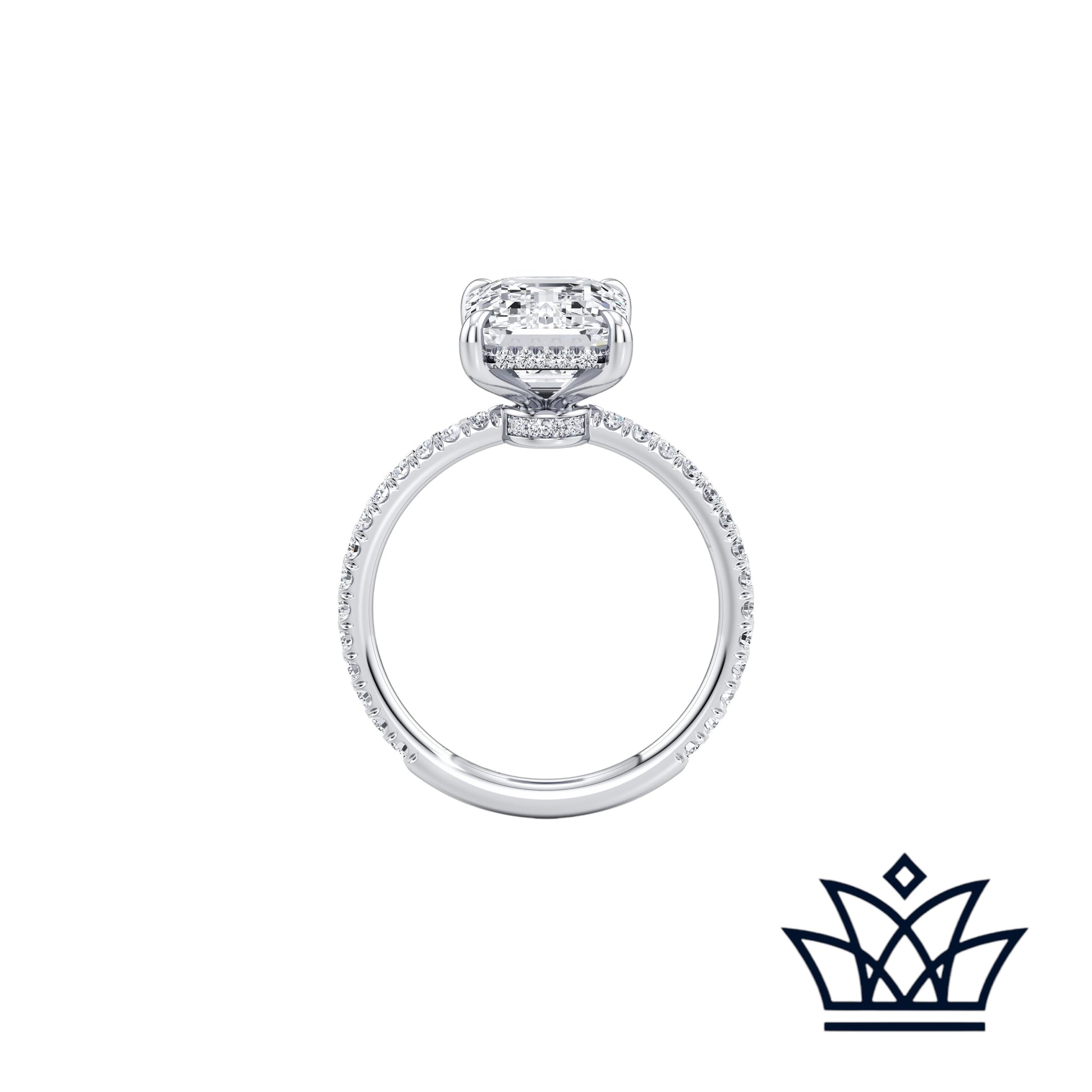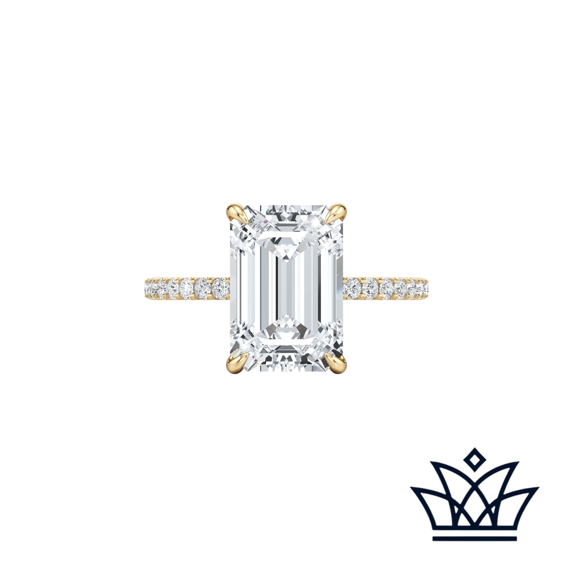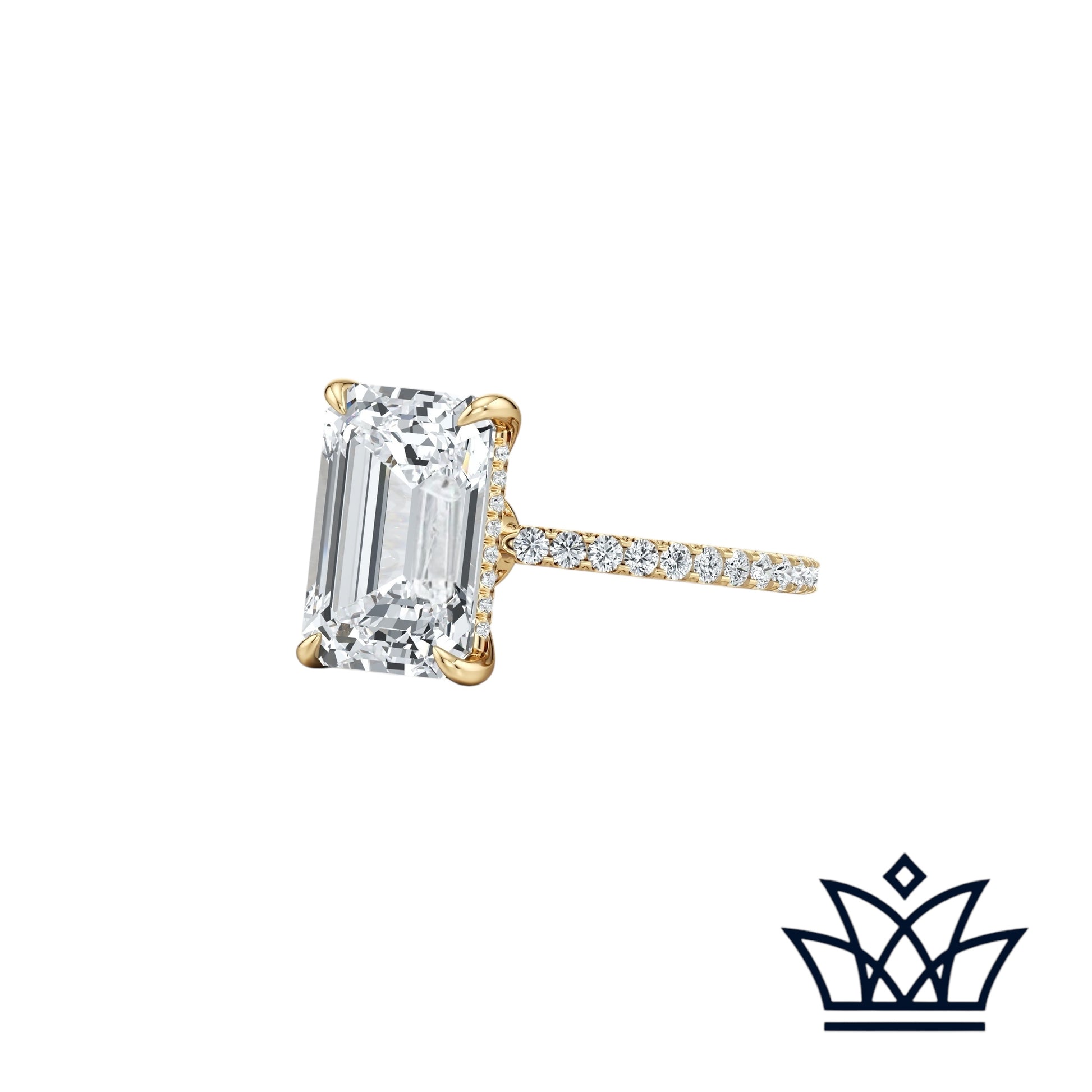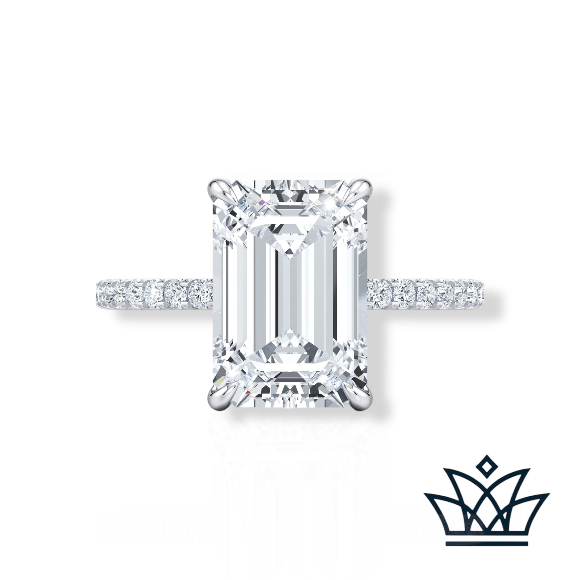 - Center Stone: 5.0 ct Emerald Lab Diamond, VVS+ / F+